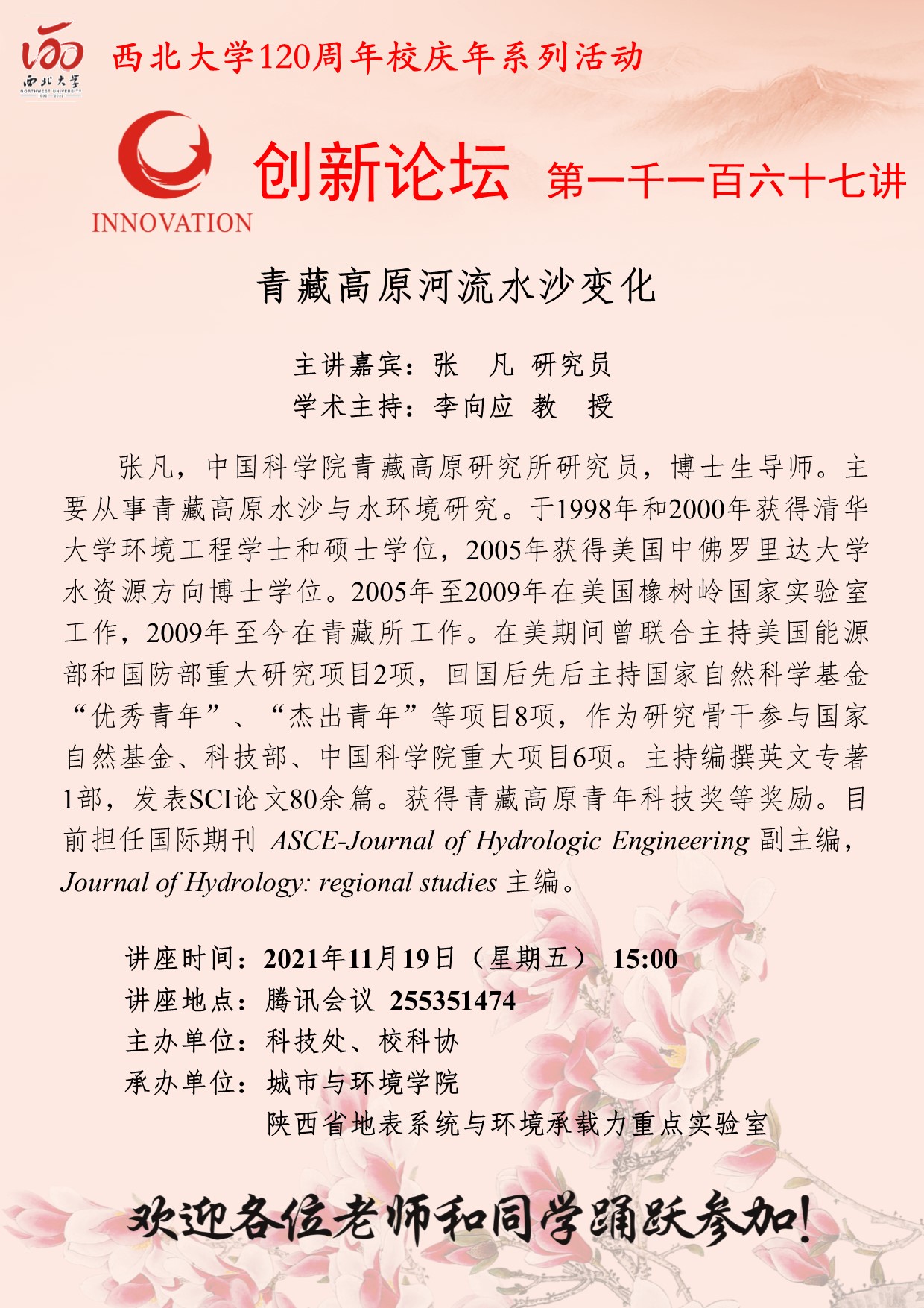 张凡 研究员 欧冠官方网站创新论坛第一千一百六十七讲暨120周年校庆年系列活动:青藏高原河流水沙变化 讲座时间 2021年11月19日(星期五) 15:00 讲座地点 腾讯会议 255351474 讲座人介绍 张凡 研究员 讲座内容