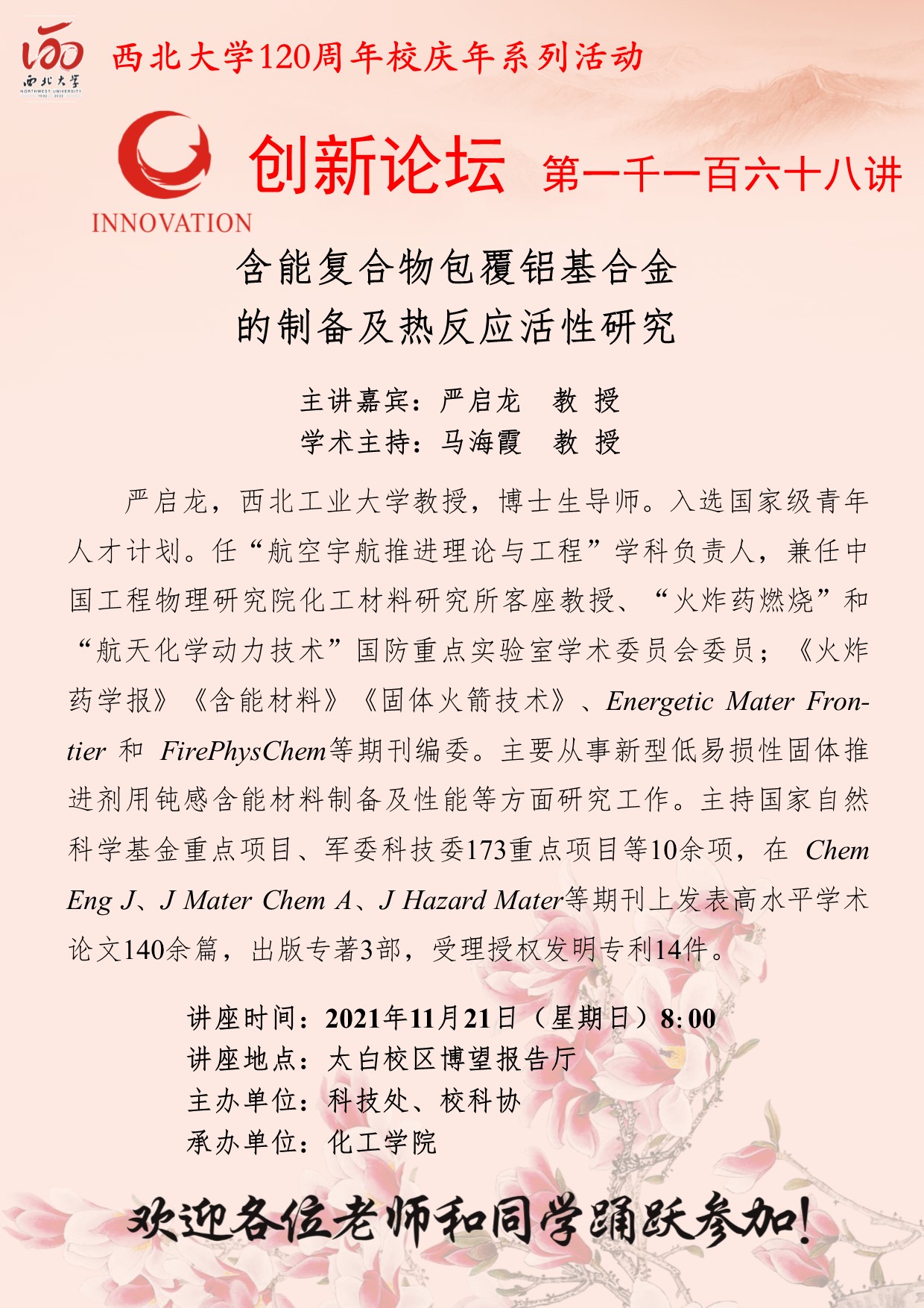 严启龙 教授 欧冠官方网站创新论坛第一千一百六十八讲暨120周年校庆年系列活动:含能复合物包覆铝基合金的制备及热反应活性研究 讲座时间 2021年11月21日(星期日)8:00 讲座地点 太白校区博望报告厅 讲座人介绍 严启龙 教授 讲座内容