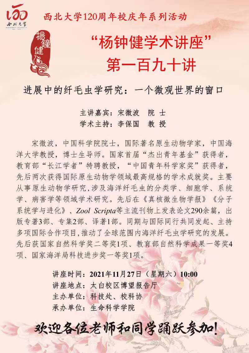 “杨钟健学术讲座”第一百九十讲暨120周年校庆年系列活动:进展中的纤毛虫学研究:一个微观世界的窗口