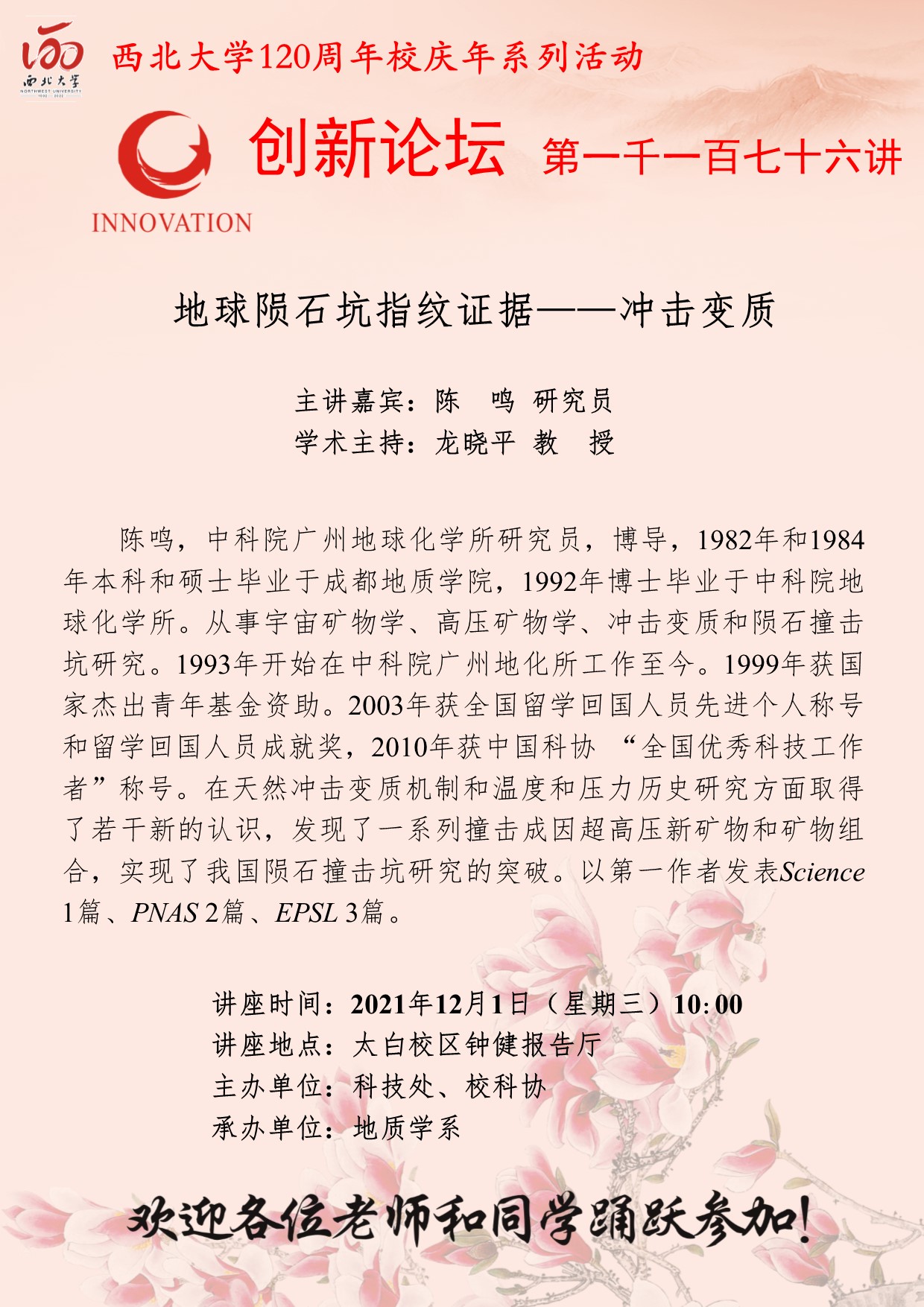 陈鸣 研究员 欧冠官方网站创新论坛第一千一百七十六讲暨120周年校庆年系列活动:地球陨石坑指纹证据——冲击变质 讲座时间 2021年12月1日(星期三)10:00 讲座地点 太白校区钟健报告厅 讲座人介绍 陈鸣 研究员 讲座内容