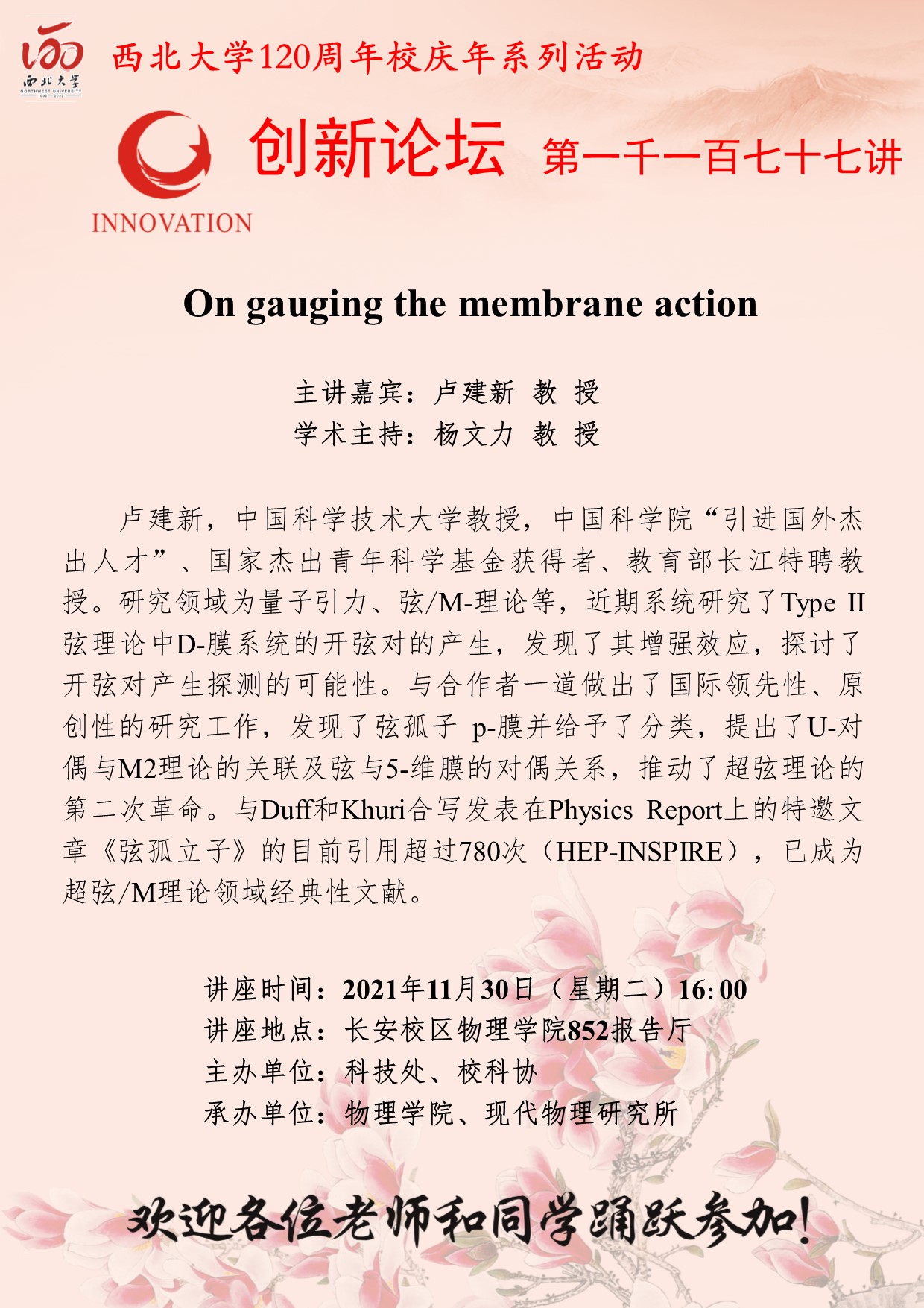 卢建新 教授 欧冠官方网站创新论坛第一千一百七十七讲暨120周年校庆年系列活动:On gauging the membrane action 讲座时间 2021年11月30日(星期二)16:00 讲座地点 长安校区物理学院852报告厅 讲座人介绍 卢建新 教授 讲座内容