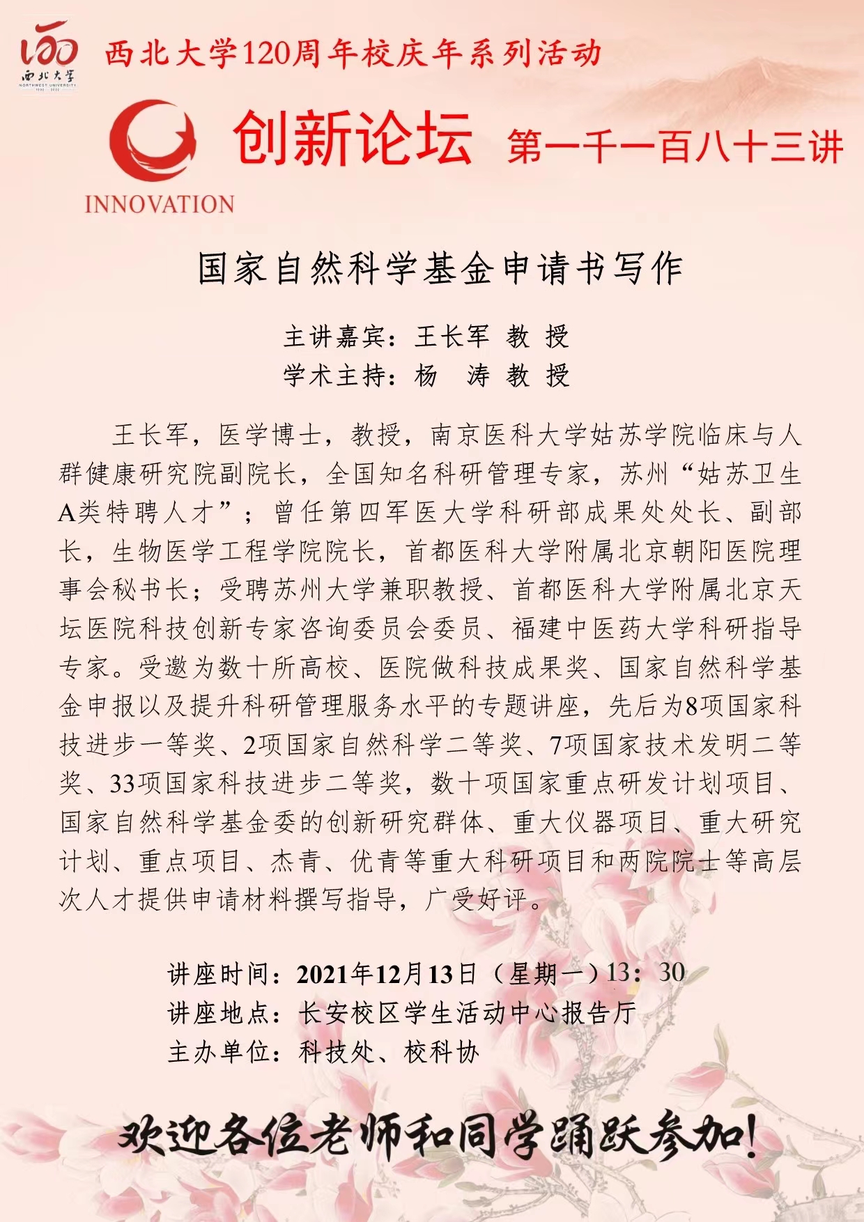 王长军 教授 欧冠官方网站创新论坛第一千一百八十三讲暨120周年校庆年系列活动:国家自然科学基金申请书写作 讲座时间 2021年12月13日(星期一)13:30 讲座地点 长安校区学生活动中心报告厅 讲座人介绍 王长军 教授 讲座内容