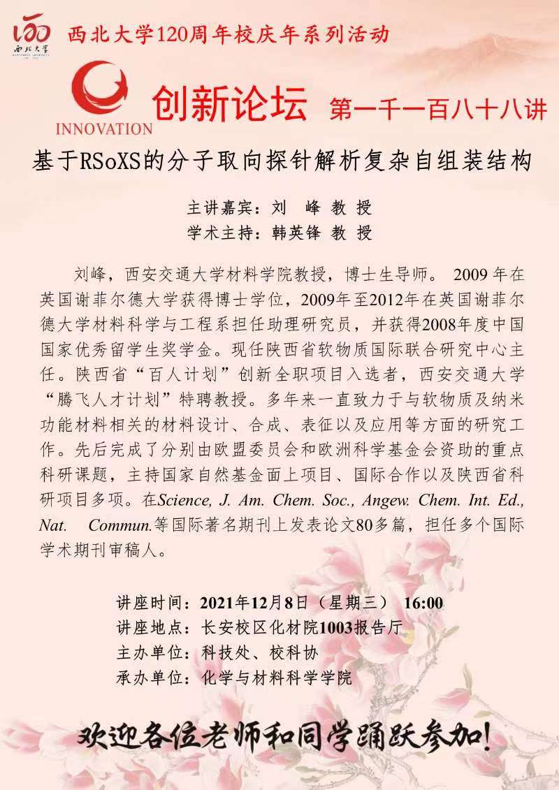 刘峰 教授 欧冠官方网站创新论坛第一千一百八十八讲暨120周年校庆年系列活动:基于RSoXS的分子取向探针解析复杂自组装结构 讲座时间 2021年12月8日(星期三) 16:00 讲座地点 长安校区化材院1003报告厅 讲座人介绍 刘峰 教授 讲座内容