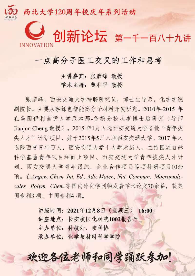 张彦峰 教授 欧冠官方网站创新论坛第一千一百八十九讲暨120周年校庆年系列活动:一点高分子医工交叉的工作和思考 讲座时间 2021年12月8日(星期三) 16:00 讲座地点 长安校区化材院1002报告厅 讲座人介绍 张彦峰 教授 讲座内容