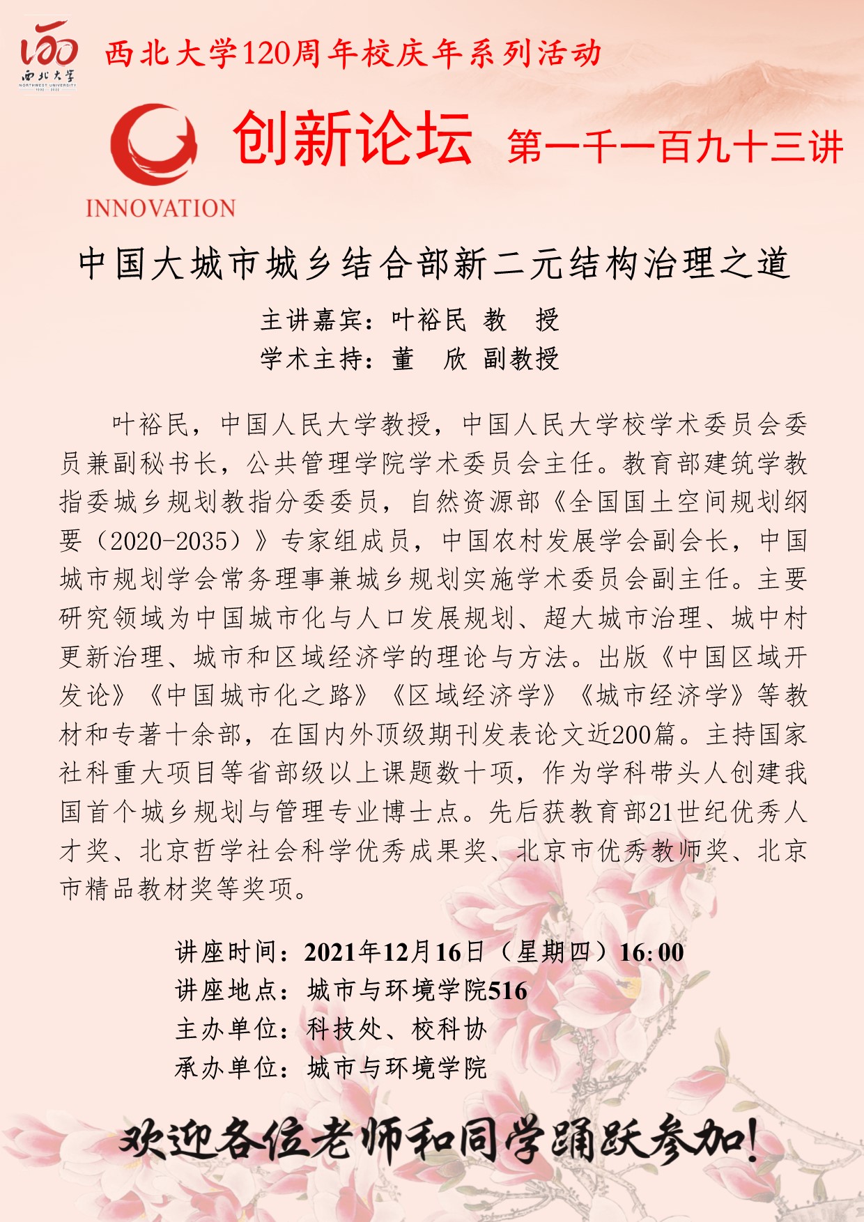 叶裕民 教授 欧冠官方网站创新论坛第一千一百九十三讲暨120周年校庆年系列活动:中国大城市城乡结合部新二元结构治理之道 讲座时间 2021年12月16日(星期四)16:00 讲座地点 城市与环境学院516 讲座人介绍 叶裕民 教授 讲座内容