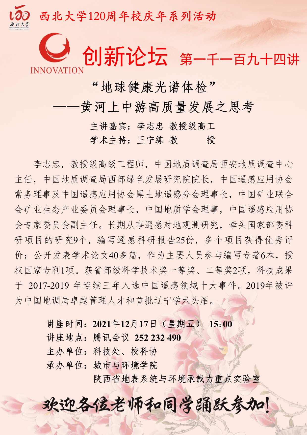 李志忠 教授级高工 欧冠官方网站创新论坛第一千一百九十四讲暨120周年校庆年系列活动:“地球健康光谱体检”——黄河上中游高质量发展之思考 讲座时间 2021年12月17日(星期五) 15:00 讲座地点 腾讯会议 252232490 讲座人介绍 李志忠 教授级高工 讲座内容
