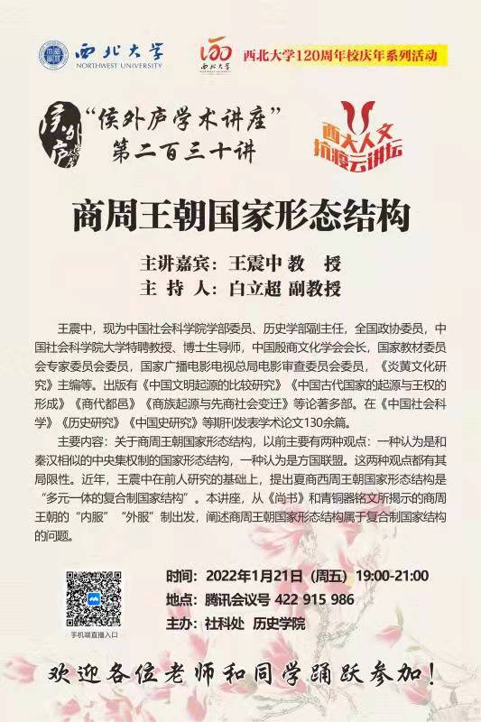 王震中 教授 侯外庐学术讲座第二百三十讲暨西大人文抗疫云讲坛:商周王朝国家形态结构 讲座时间 2022年1月21日(周五)19:00-21:00 讲座地点 腾讯会议:422915986 讲座人介绍 王震中 教授 讲座内容