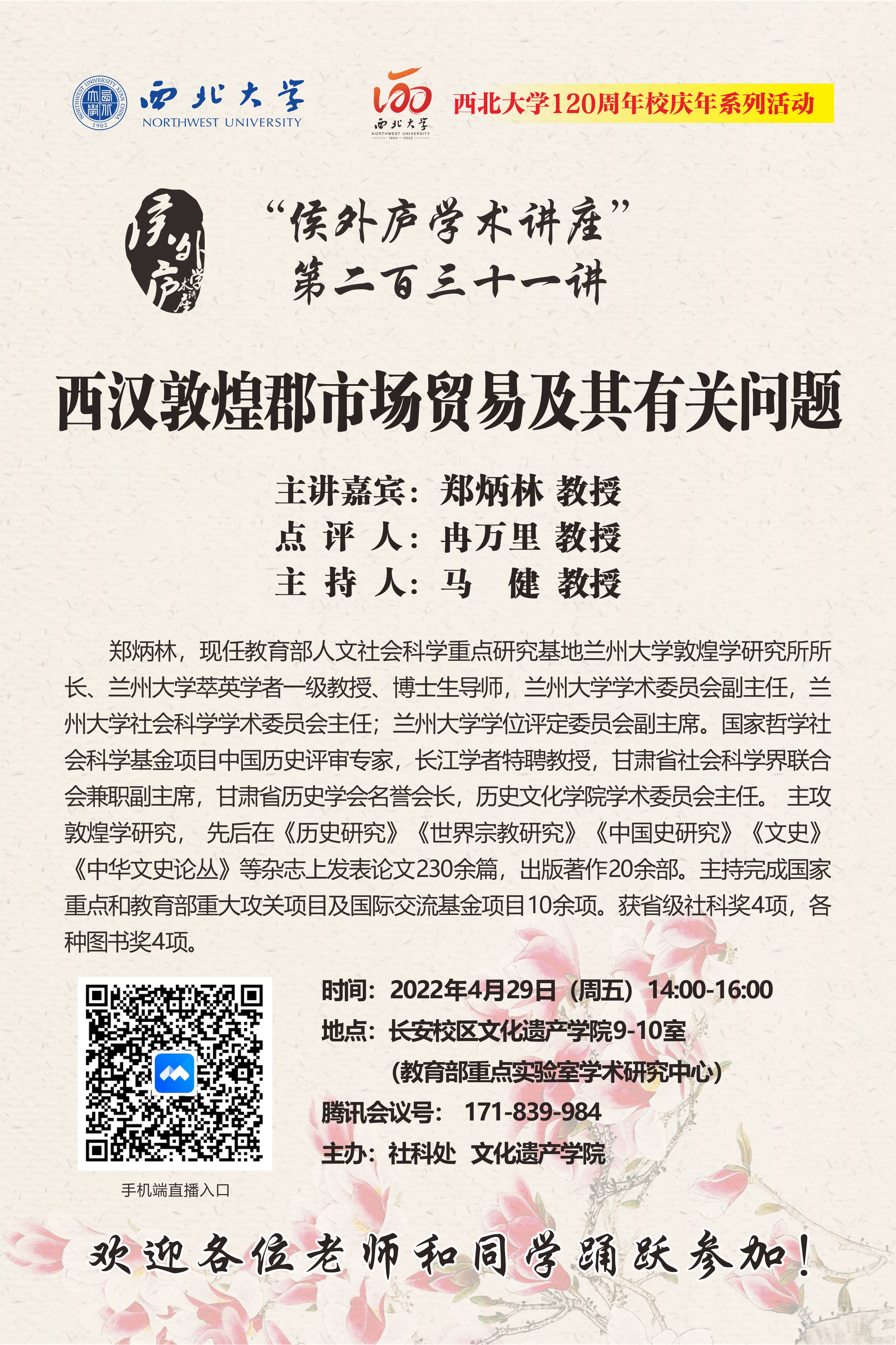 侯外庐学术讲座第二百三十一讲暨120周年校庆年系列活动:西汉敦煌郡市场贸易及其有关问题