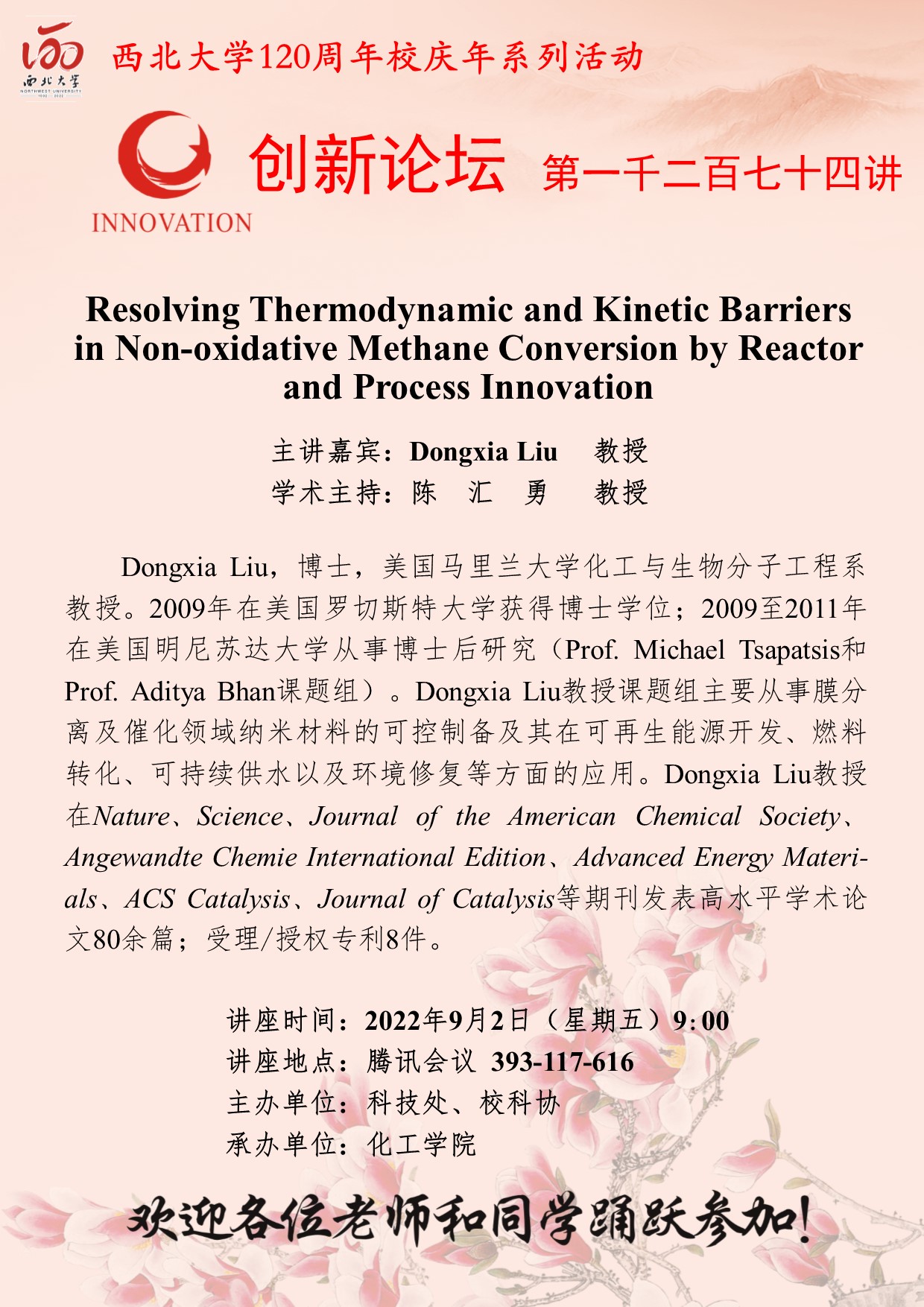 Dongxia Liu 教授 欧冠官方网站创新论坛第一千二百七十四讲暨120周年校庆年系列活动:Resolving Thermodynamic and Kinetic Barriers in Non-oxidative Methane Conversion by Reactor and Process Innovation 讲座时间 2022年9月2日(星期五)9:00 讲座地点 腾讯会议 393-117-616 讲座人介绍 Dongxia Liu 教授 讲座内容