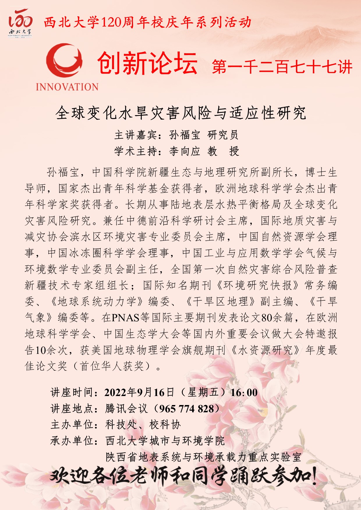 孙福宝 研究员 欧冠官方网站创新论坛第一千二百七十七讲暨120周年校庆年系列活动:全球变化水旱灾害风险与适应性研究 讲座时间 2022年9月16日(星期五)16:00 讲座地点 腾讯会议(965 774 828) 讲座人介绍 孙福宝 研究员 讲座内容