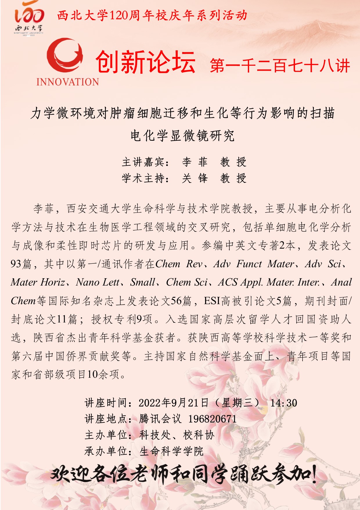 李 菲 教 授 欧冠官方网站创新论坛第一千二百七十八讲暨120周年校庆年系列活动:力学微环境对肿瘤细胞迁移和生化等行为影响的扫描电化学显微镜研究 讲座时间 2022年9月21日(星期三) 14:30 讲座地点 腾讯会议 196820671 讲座人介绍 李 菲 教 授 讲座内容