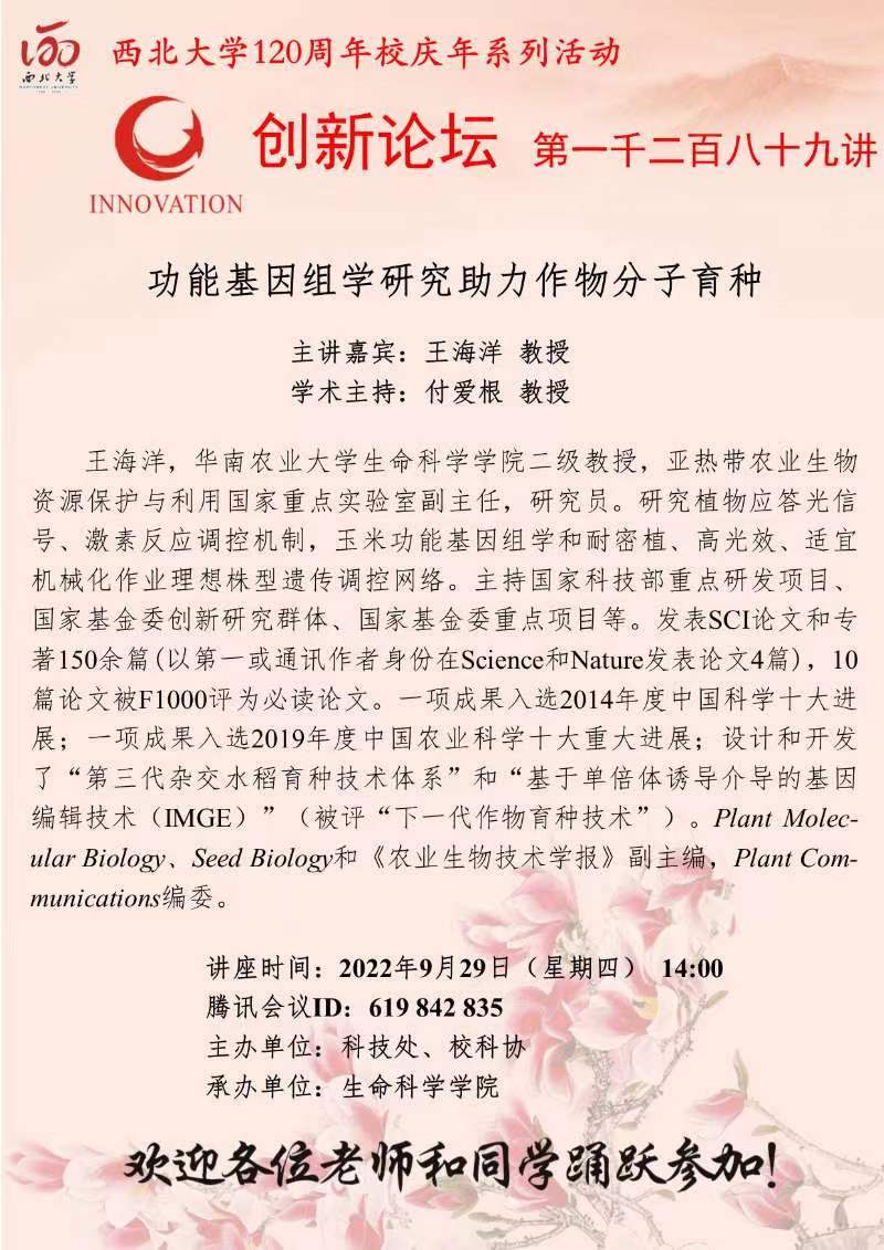 王海洋 教授 欧冠官方网站创新论坛第一千二百八十九讲暨120周年校庆年系列活动: 功能基因组学研究助力作物分子育种 讲座时间 2022年9月29日(星期四) 14:00 讲座地点 腾讯会议 619 842 835 讲座人介绍 王海洋 教授 讲座内容