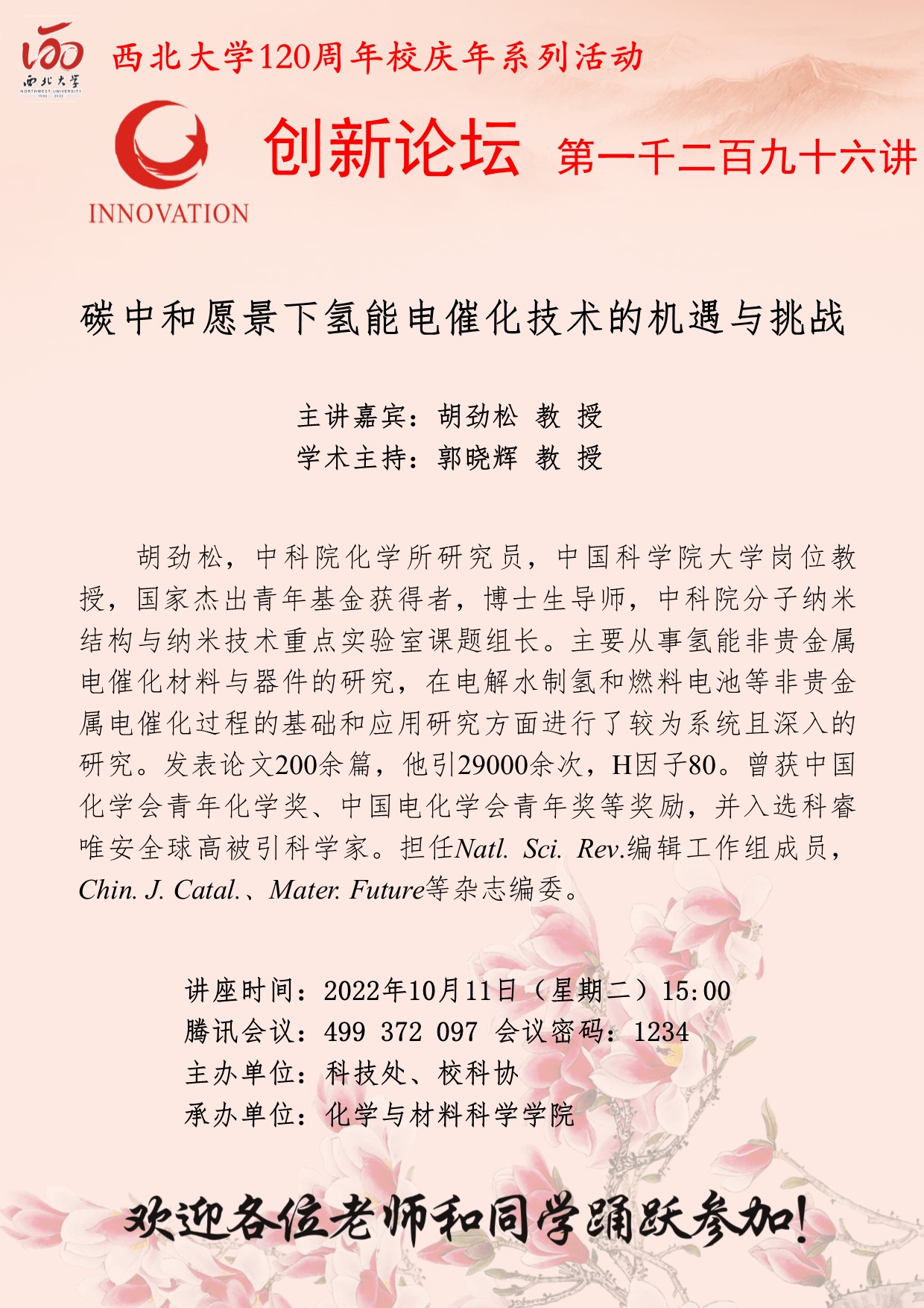 胡劲松 教授 欧冠官方网站创新论坛第一千二百九十六讲暨120周年校庆年系列活动: 碳中和愿景下氢能电催化技术的机遇与挑战 讲座时间 2022年10月11日(星期二)15:00 讲座地点 腾讯会议 499 372 097 会议密码 1234 讲座人介绍 胡劲松 教授 讲座内容