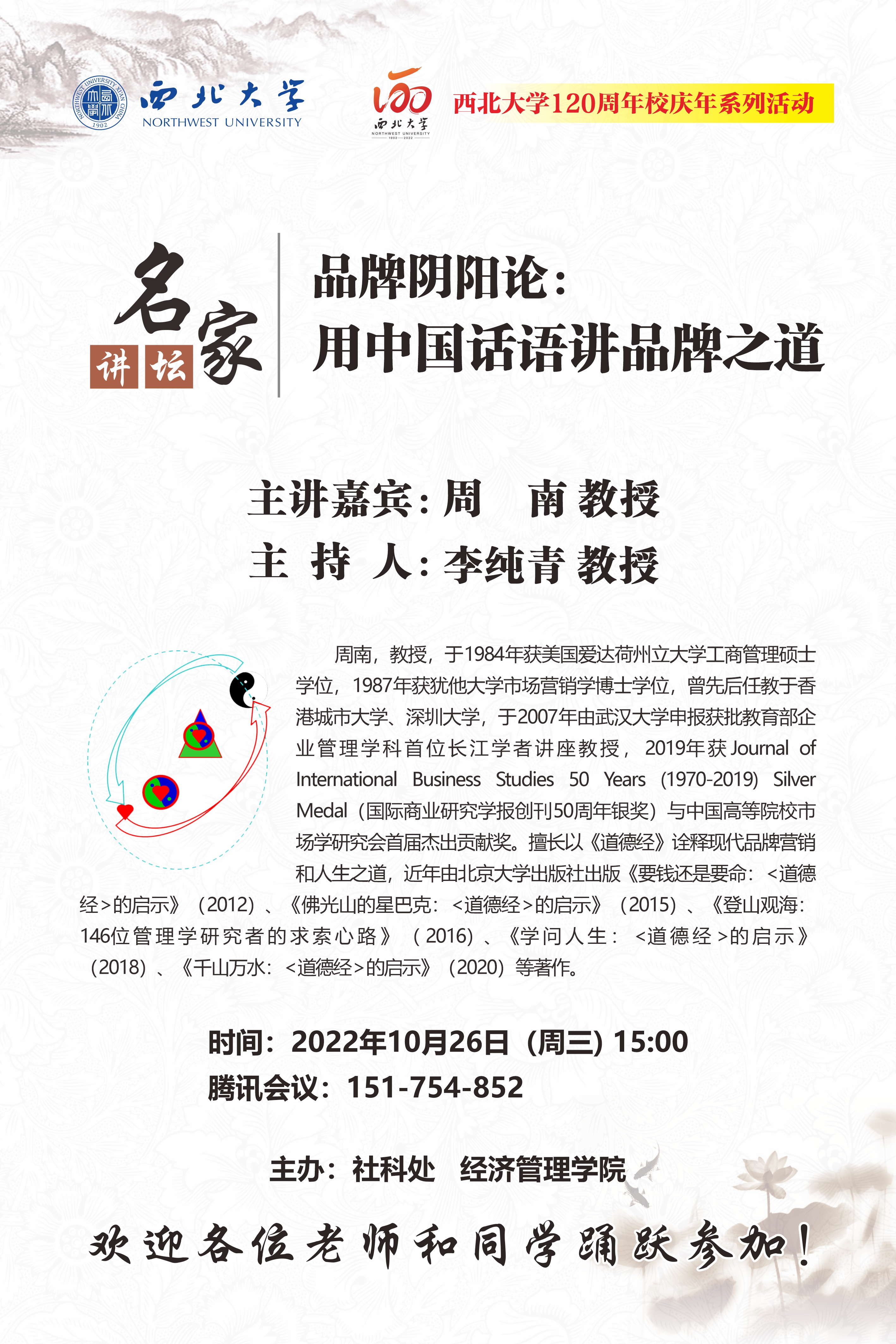 周南 教授 名家讲坛暨120周年校庆年系列活动:品牌阴阳论:用中国话语讲品牌之道 讲座时间 2022年10月26日(周三)15:00 讲座地点 腾讯会议:151754852 讲座人介绍 周南 教授 讲座内容