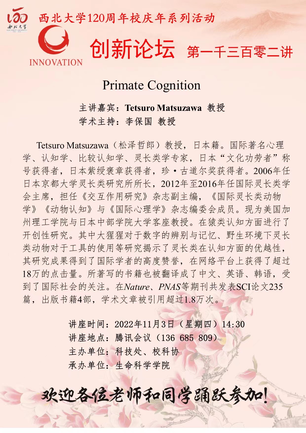 Tetsuro Matsuzawa 教授 欧冠官方网站创新论坛第一千三百零二讲暨120周年校庆年系列活动: Primate Cognition 讲座时间 2022年11月3日(星期四)14:30 讲座地点 腾讯会议 136 685 809 讲座人介绍 Tetsuro Matsuzawa 教授 讲座内容