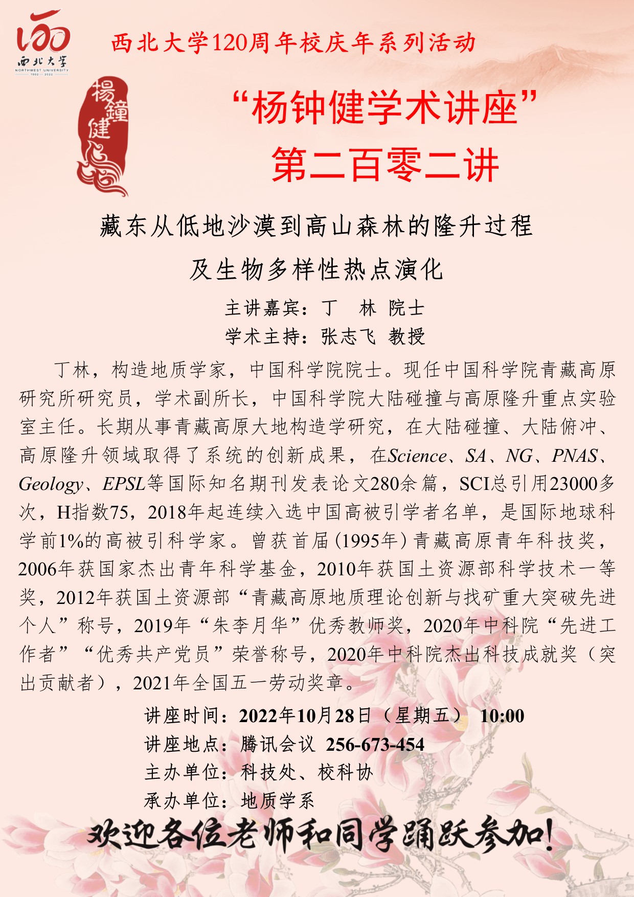 “杨钟健学术讲座”第二百零二讲暨120周年校庆年系列活动: 藏东从低地沙漠到高山森林的隆升过程及生物多样性热点演化