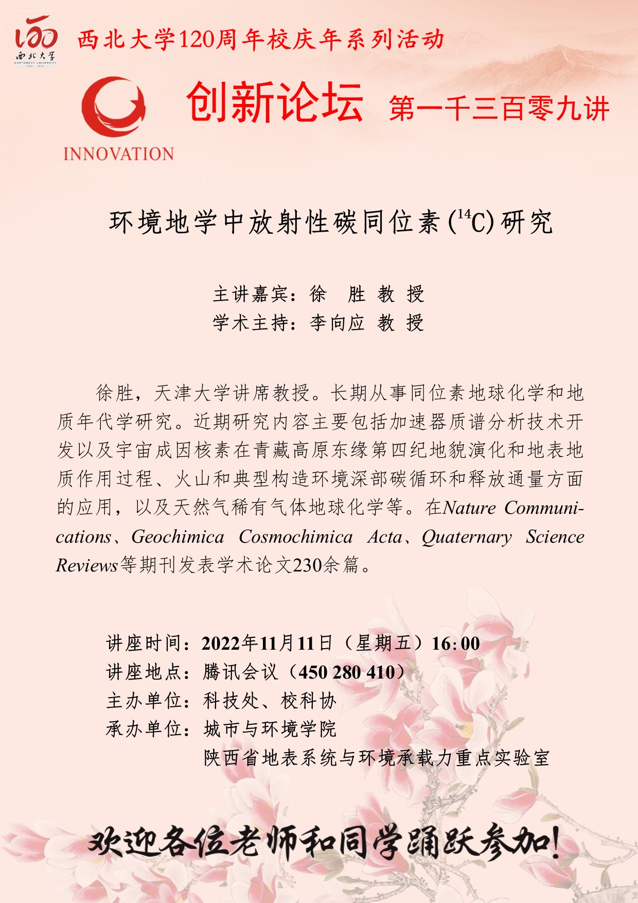 徐胜 教授 欧冠官方网站创新论坛第一千三百零九讲暨120周年校庆年系列活动: 环境地学中放射性碳同位素(14C)研究 讲座时间 2022年11月11日(星期五)16:00 讲座地点 腾讯会议(450 280 410) 讲座人介绍 徐胜 教授 讲座内容