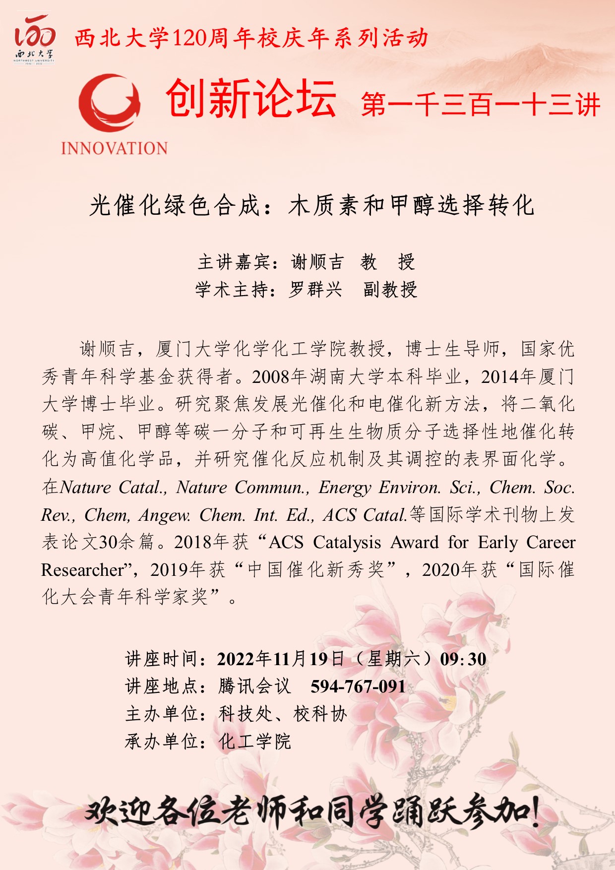 谢顺吉 教授 欧冠官方网站创新论坛第一千三百一十三讲暨120周年校庆年系列活动: 光催化绿色合成:木质素和甲醇选择转化 讲座时间 2022年11月19日(星期六)09:30 讲座地点 腾讯会议( 594-767-091) 讲座人介绍 谢顺吉 教授 讲座内容