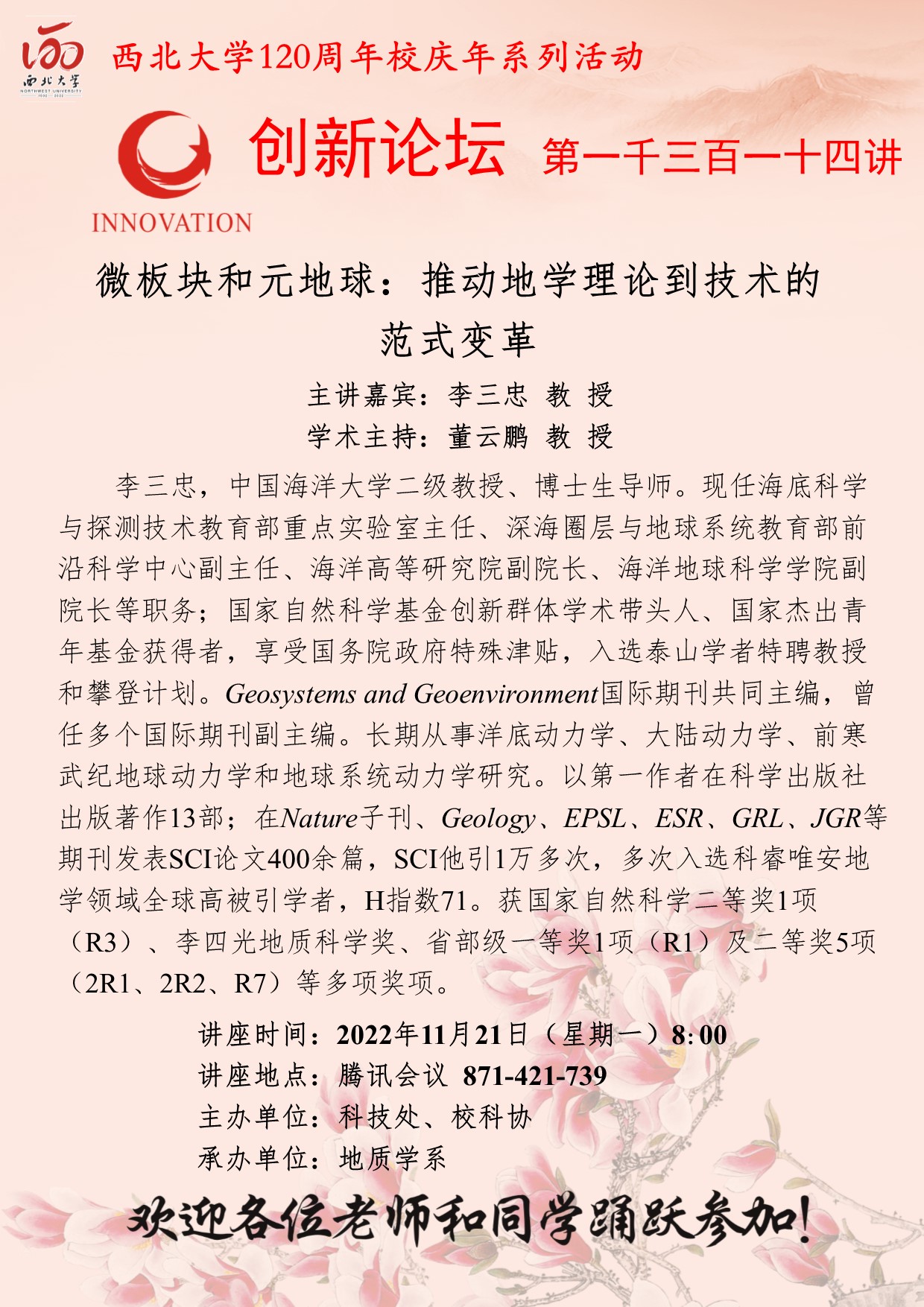 李三忠 教授 欧冠官方网站创新论坛第一千三百一十四讲暨120周年校庆年系列活动: 微板块和元地球:推动地学理论到技术的范式变革 讲座时间 2022年11月21日(星期一)8:00 讲座地点 腾讯会议(871-421-739) 讲座人介绍 李三忠 教授 讲座内容