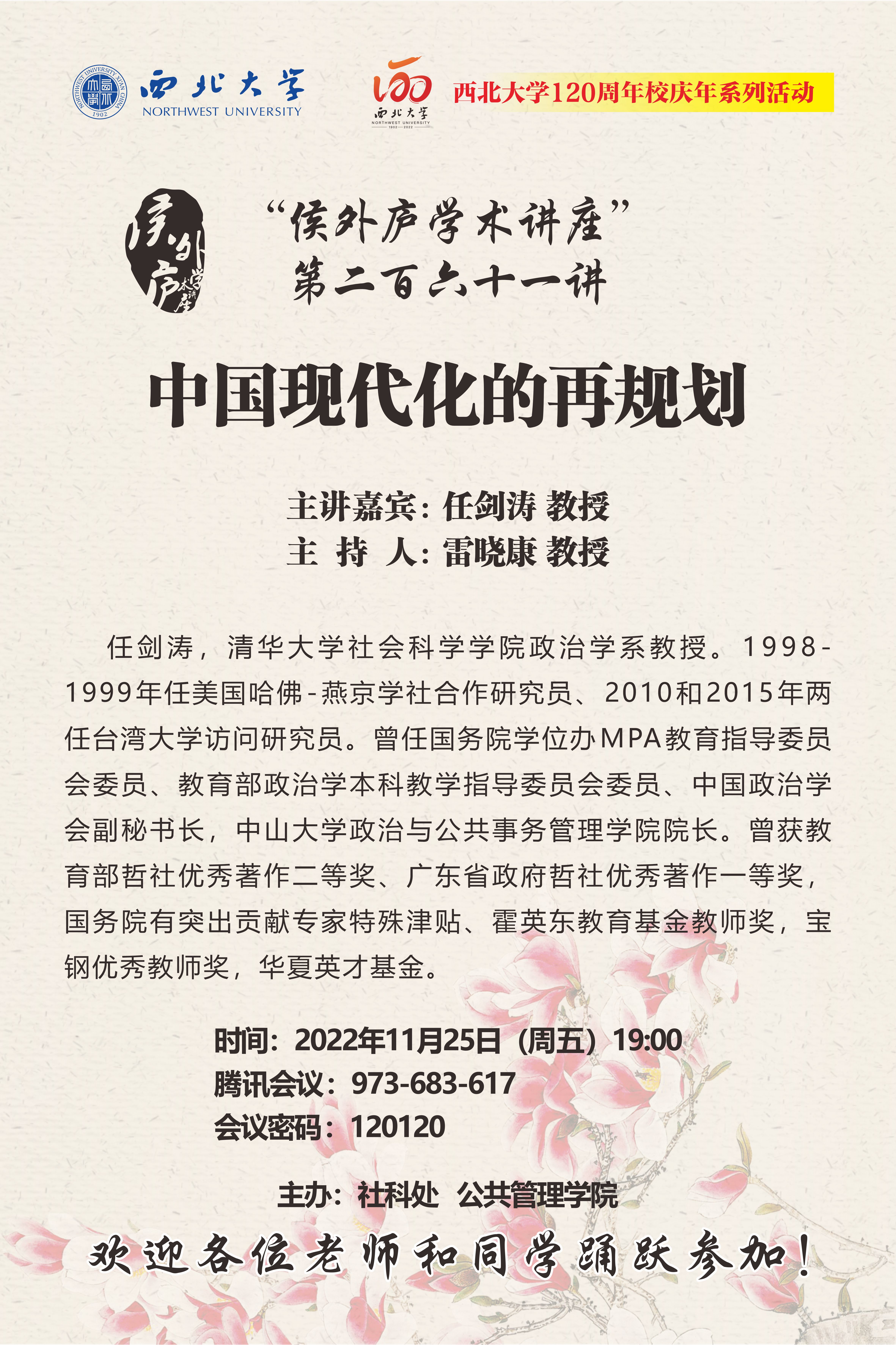 任剑涛 教授 侯外庐学术讲座第二百六十一讲暨120周年校庆年系列活动:中国现代化的再规划 讲座时间 2022年11月25日(周五)19:00 讲座地点 腾讯会议:973-683-617 讲座人介绍 任剑涛 教授 讲座内容