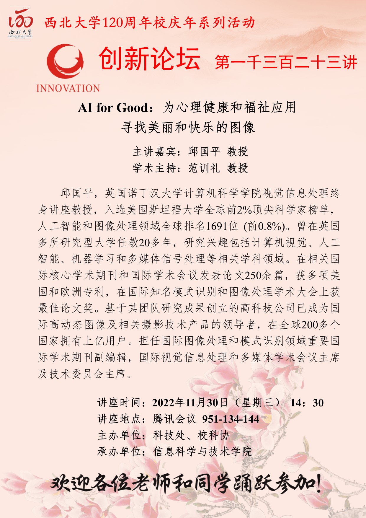 邱国平 教授 欧冠官方网站创新论坛第一千三百二十三讲暨120周年校庆年系列活动:AI for Good:为心理健康和福祉应用寻找美丽和快乐的图像 讲座时间 2022年11月30日(星期三) 14:30 讲座地点 腾讯会议 951-134-144 讲座人介绍 邱国平 教授 讲座内容