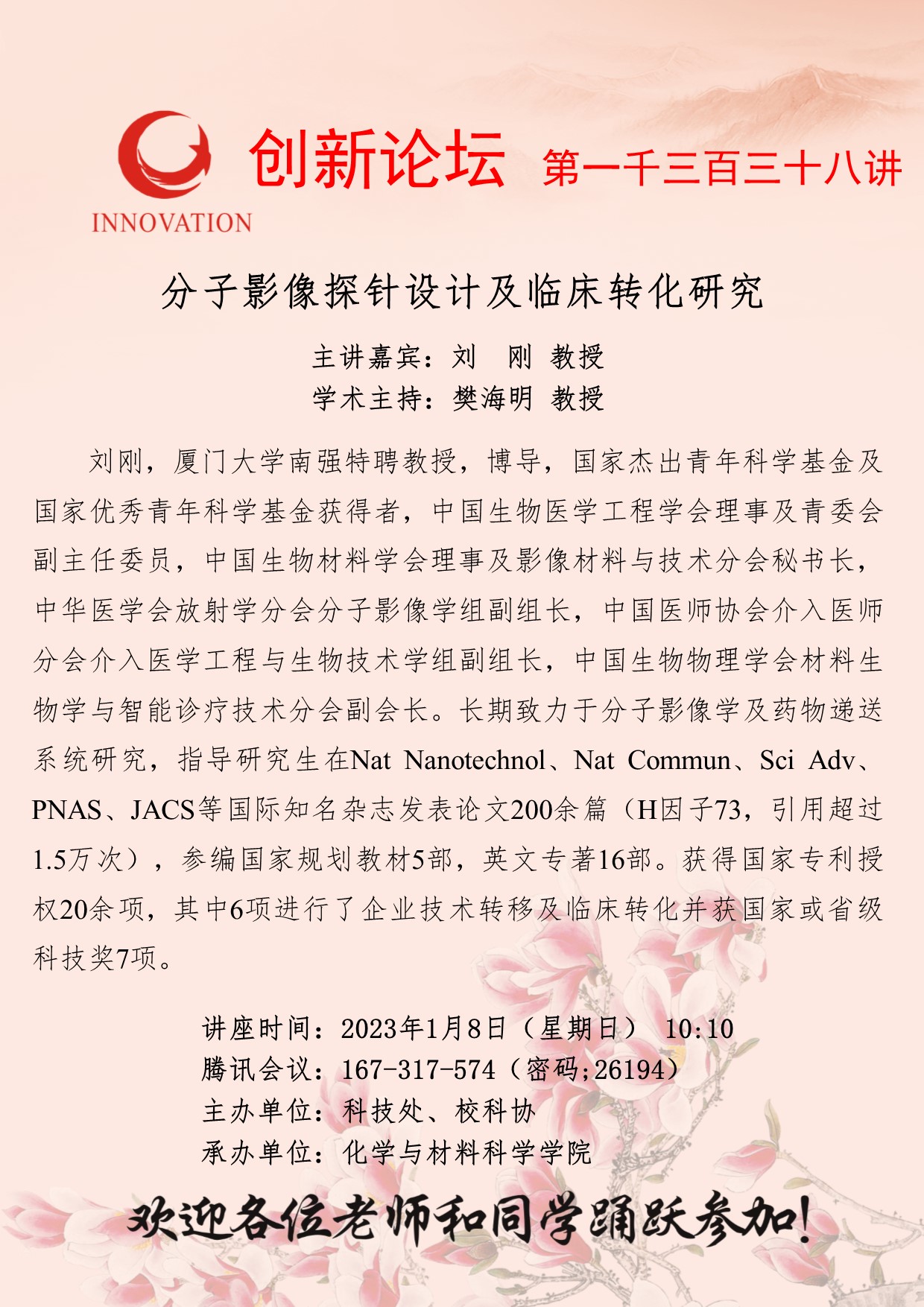 刘刚 教授 欧冠官方网站创新论坛第一千三百三十八讲:分子影像探针设计及临床转化研究 讲座时间 2023年1月8日(星期日) 10:10 讲座地点 腾讯会议:167-317-574 讲座人介绍 刘刚 教授 讲座内容