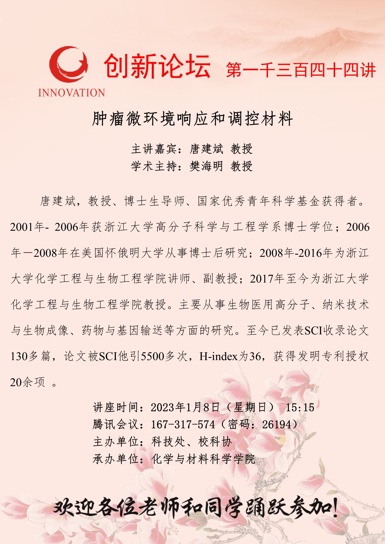 唐建斌 教授 欧冠官方网站创新论坛第一千三百四十四讲:肿瘤微环境响应和调控材料 讲座时间 2023年1月8日(星期日) 15:15 讲座地点 腾讯会议:167-317-574 讲座人介绍 唐建斌 教授 讲座内容