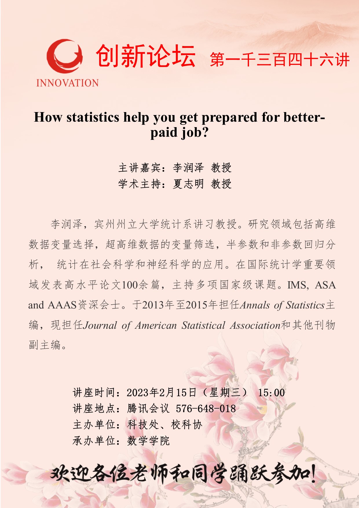 李润泽 教授 欧冠官方网站创新论坛第一千三百四十六讲:How statistics help you get prepared for better-paid job? 讲座时间 2023年2月15日(星期三) 15:00 讲座地点 腾讯会议 576-648-018 讲座人介绍 李润泽 教授 讲座内容