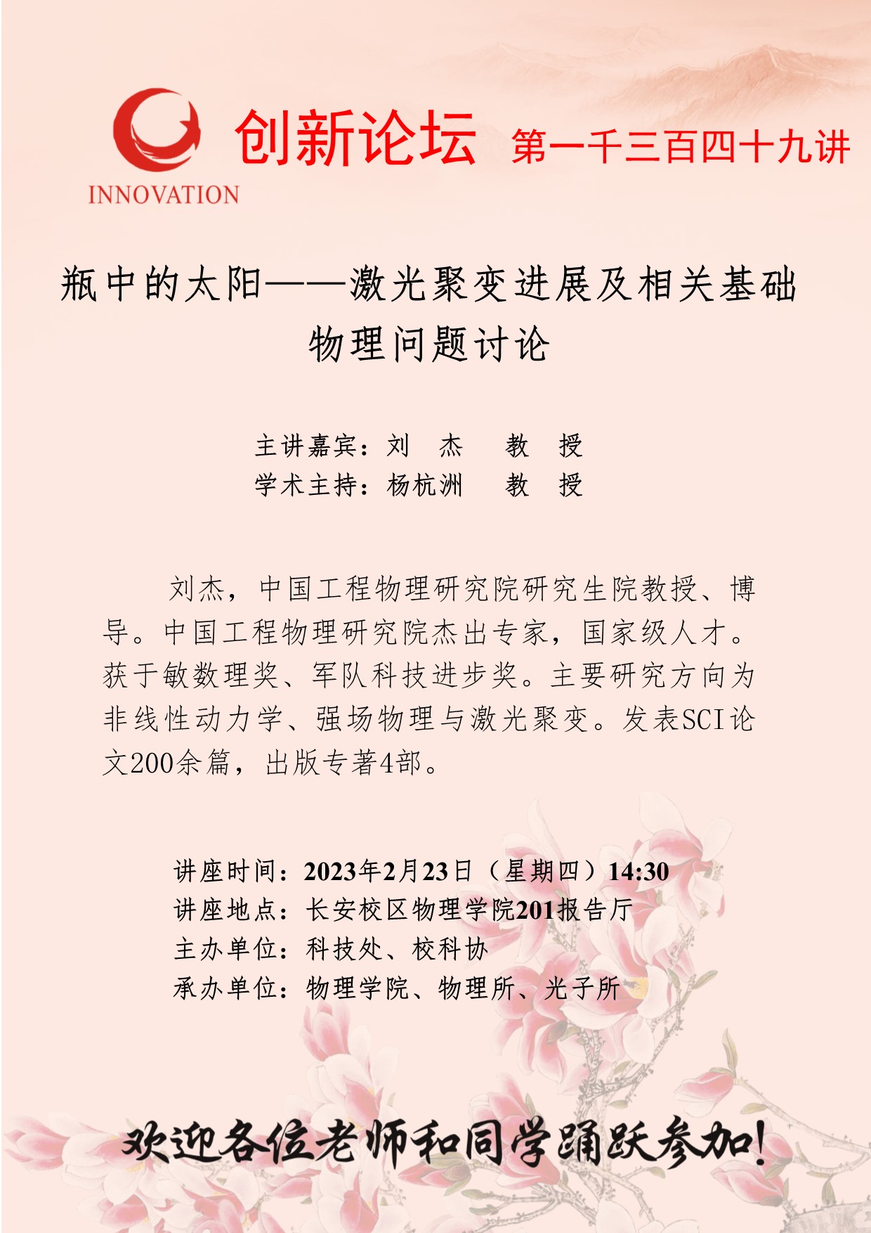 刘杰 教授 欧冠官方网站创新论坛第一千三百四十九讲:瓶中的太阳——激光聚变进展及相关基础物理问题讨论 讲座时间 2023年2月23日(星期四)14:30 讲座地点 长安校区物理学院201报告厅 讲座人介绍 刘杰 教授 讲座内容