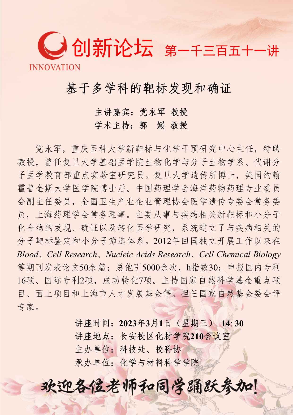 党永军 教授 欧冠官方网站创新论坛第一千三百五十一讲:基于多学科的靶标发现和确证 讲座时间 2023年3月1日(星期三) 14: 30 讲座地点 长安校区化材学院210会议室 讲座人介绍 党永军 教授 讲座内容