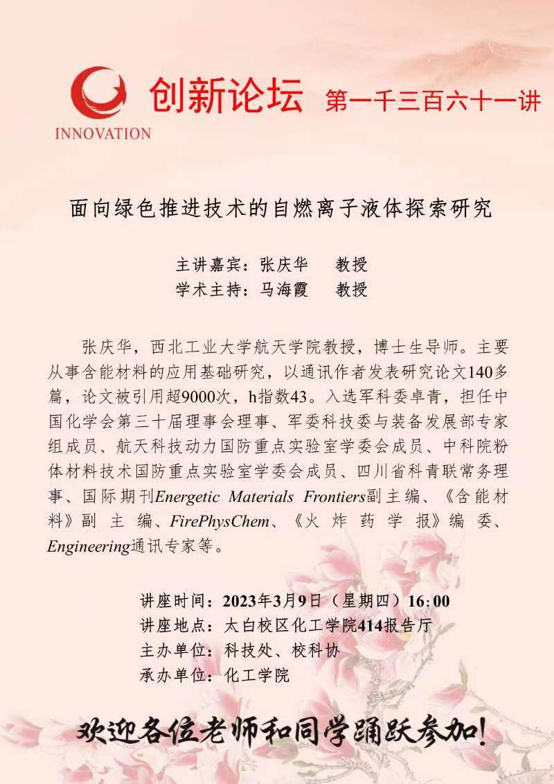 张庆华 教授 欧冠官方网站创新论坛第一千三百六十一讲:面向绿色推进技术的自燃离子液体探索研究 讲座时间 2023年3月9日(星期四)16:00 讲座地点 太白校区化工学院414报告厅 讲座人介绍 张庆华 教授 讲座内容