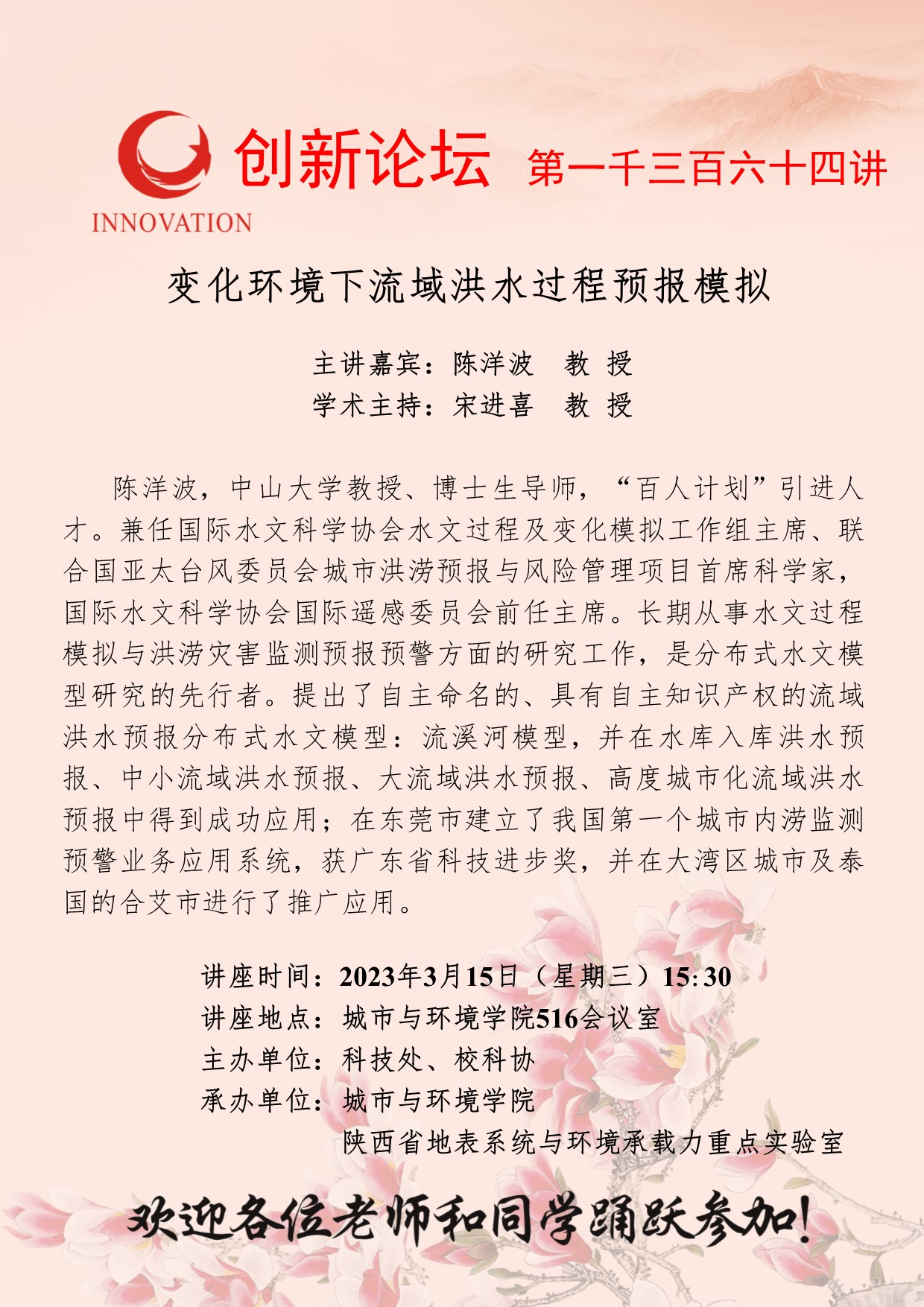 陈洋波 教授 欧冠官方网站创新论坛第一千三百六十四讲:变化环境下流域洪水过程预报模拟 讲座时间 2023年3月15日(星期三)15:30 讲座地点 城市与环境学院516会议室 讲座人介绍 陈洋波 教授 讲座内容