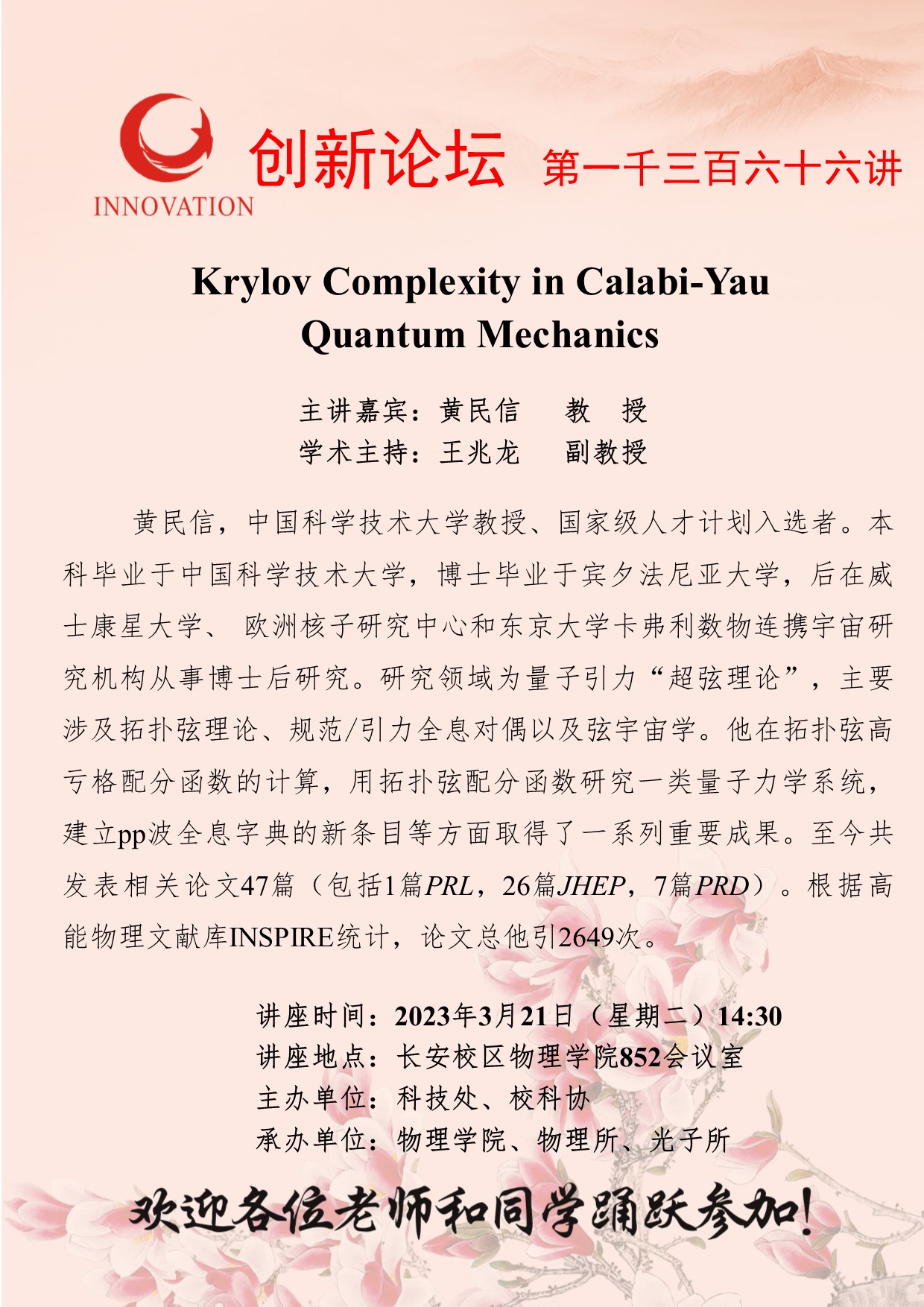 黄民信 教授 欧冠官方网站创新论坛第一千三百六十六讲:Krylov Complexity in Calabi-Yau Quantum Mechanics 讲座时间 2023年3月21日(星期二)14:30 讲座地点 长安校区物理学院852会议室 讲座人介绍 黄民信 教授 讲座内容