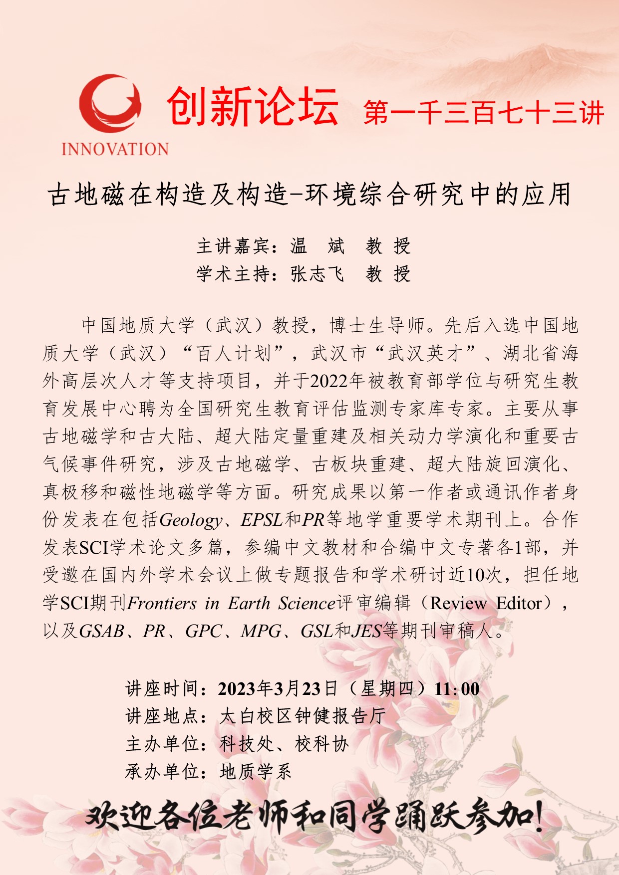 温斌 教授 欧冠官方网站创新论坛第一千三百七十三讲:古地磁在构造及构造-环境综合研究中的应用 讲座时间 2023年3月23日(星期四)11:00 讲座地点 太白校区钟健报告厅 讲座人介绍 温斌 教授 讲座内容
