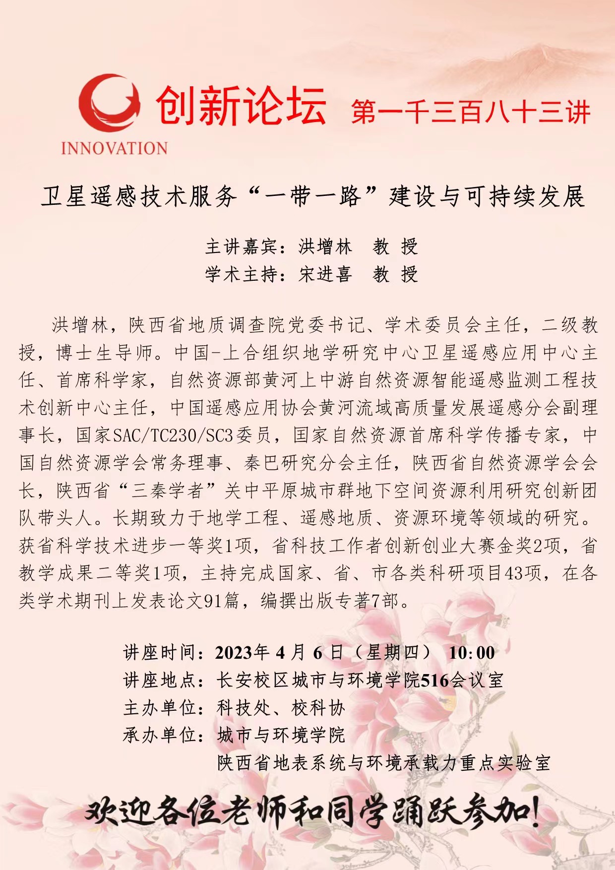 洪增林 教 授 欧冠官方网站创新论坛第一千三百八十三讲:卫星遥感技术服务“一带一路”建设与可持续发展 讲座时间 2023年 4 月 6 日(星期四) 10:00 讲座地点 长安校区城市与环境学院516会议室 讲座人介绍 洪增林 教 授 讲座内容