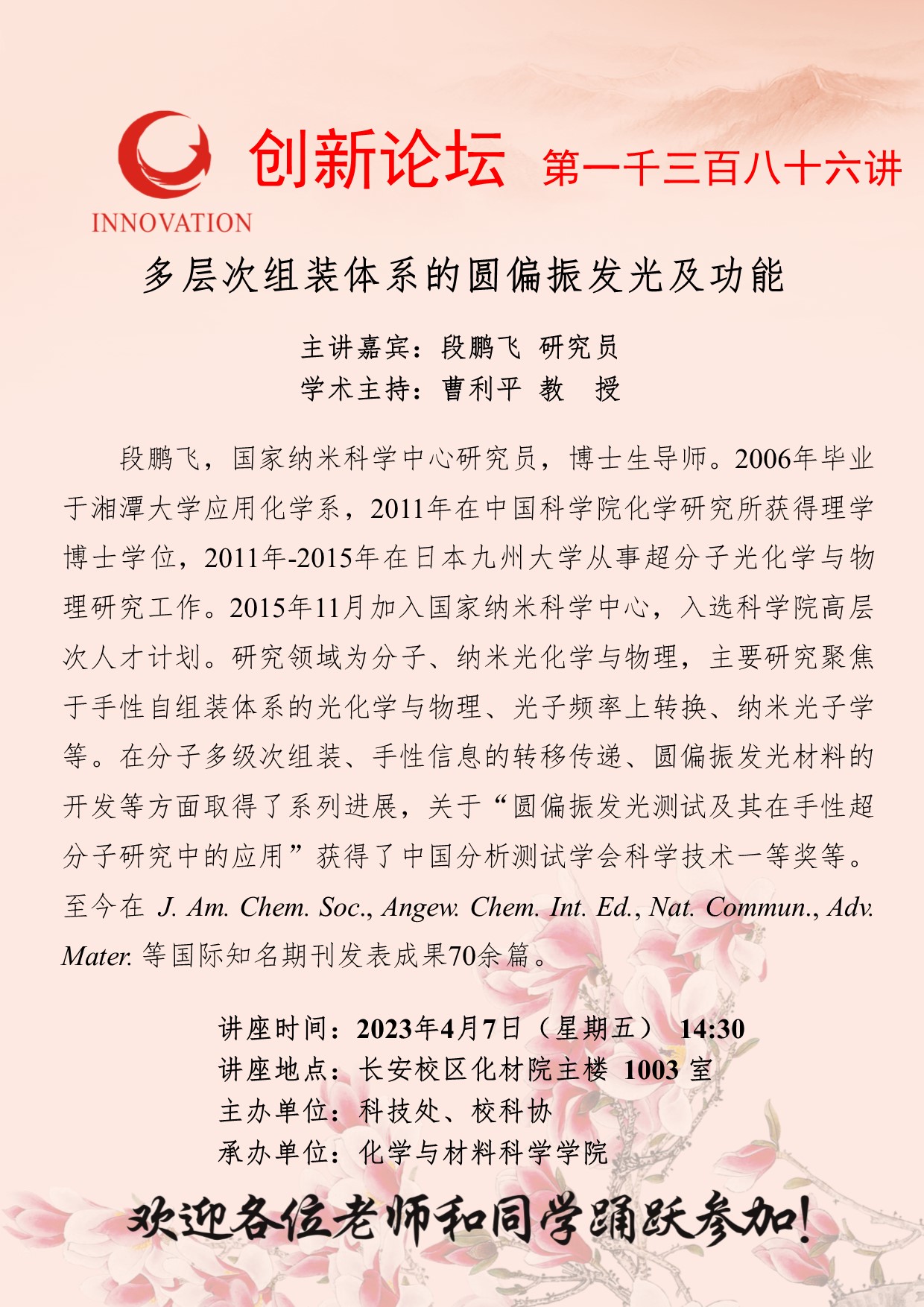 段鹏飞 研究员 欧冠官方网站创新论坛第一千三百八十六讲:多层次组装体系的圆偏振发光及功能应用 讲座时间 2023年4月7日(星期五) 14:30 讲座地点 长安校区化材院主楼 1003 室 讲座人介绍 段鹏飞 研究员 讲座内容