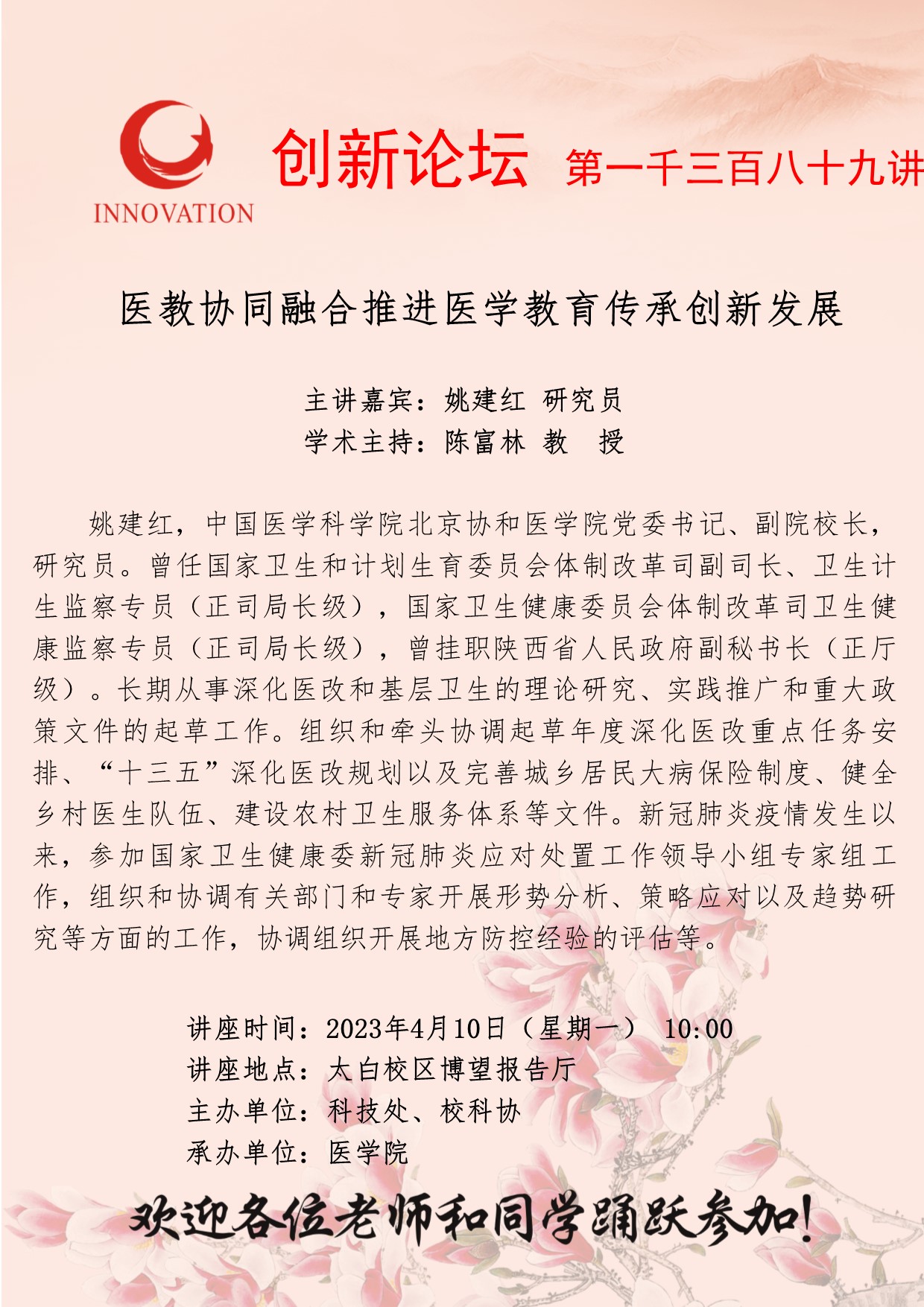 姚建红 研究员 欧冠官方网站创新论坛第一千三百八十九讲:医教协同融合推进医学教育传承创新发展 讲座时间 2023年4月10日(星期一) 10:00 讲座地点 太白校区博望报告厅 讲座人介绍 姚建红 研究员 讲座内容
