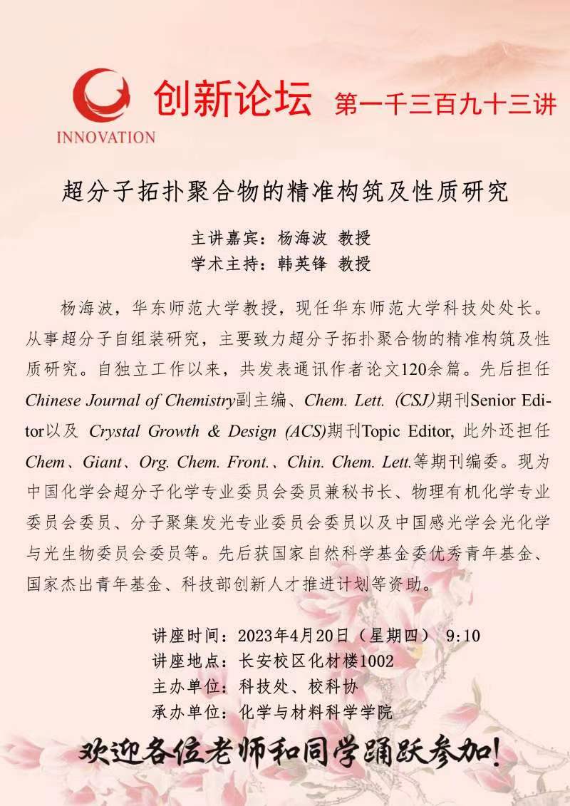 杨海波 教授 欧冠官方网站创新论坛第一千三百九十三讲:超分子拓扑聚合物的精准构筑及性质研究 讲座时间 2023年4月20日(星期四) 9:10 讲座地点 长安校区化材楼1002 讲座人介绍 杨海波 教授 讲座内容