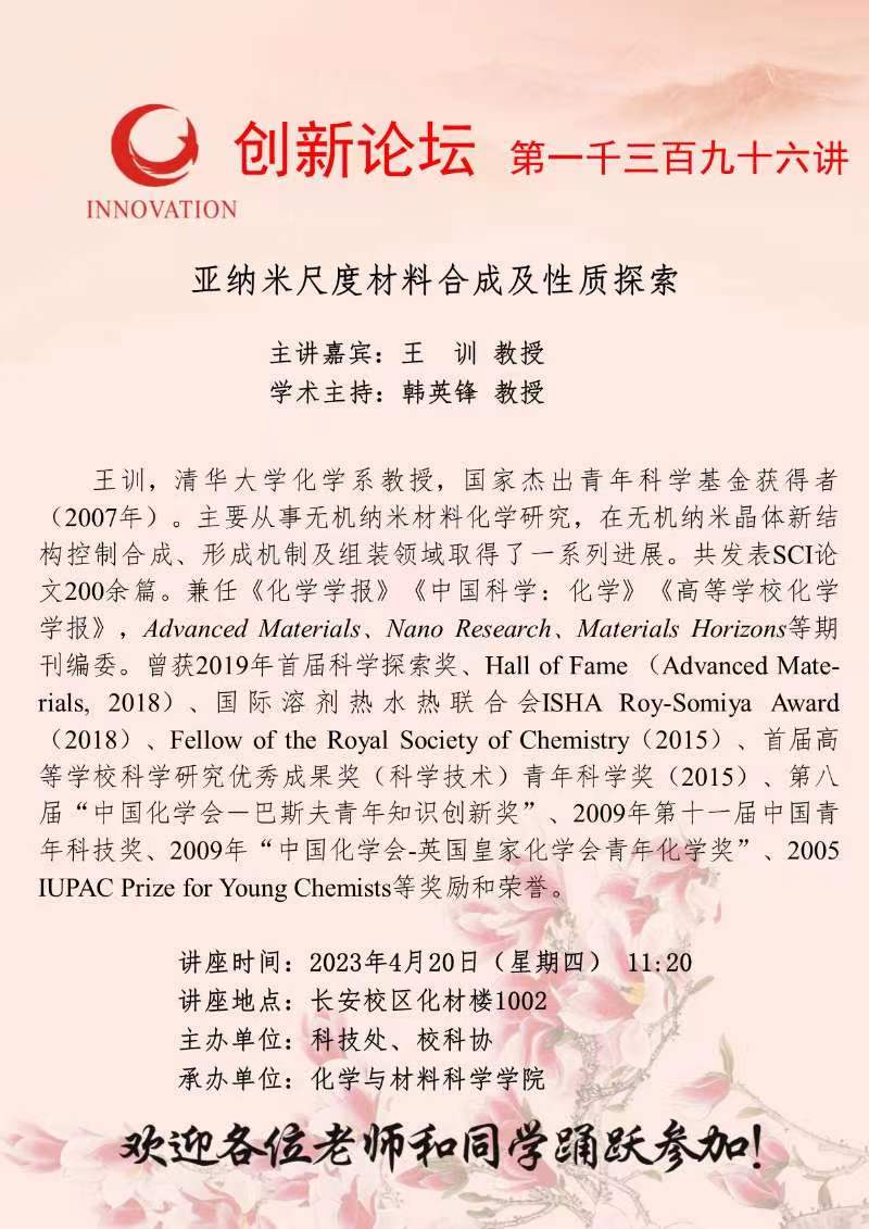 王 训 教授 欧冠官方网站创新论坛第一千三百九十六讲:亚纳米尺度材料合成及性质探索 讲座时间 2023年4月20日(星期四) 11:20 讲座地点 长安校区化材楼1002 讲座人介绍 王 训 教授 讲座内容