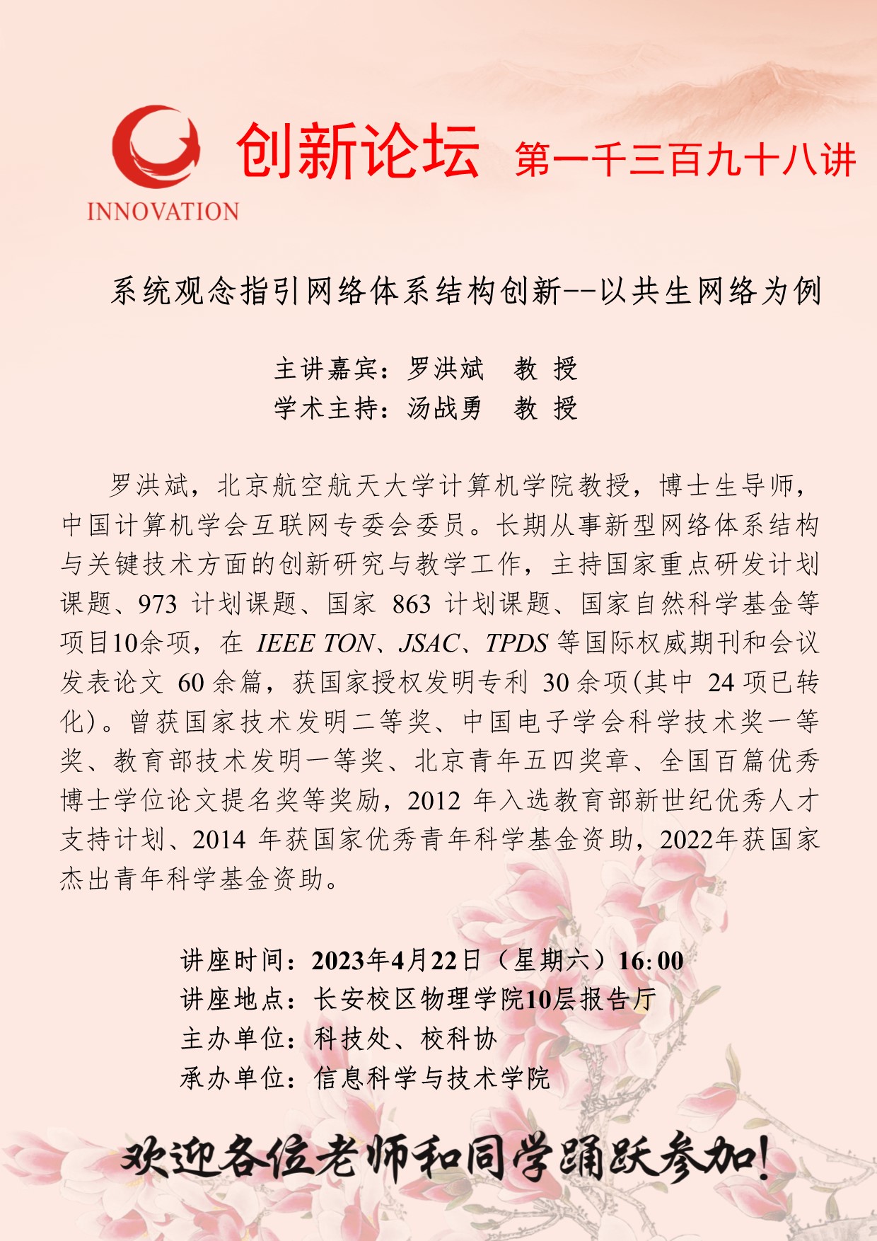 罗洪斌 教 授 欧冠官方网站创新论坛第一千三百九十八讲:系统观念指引网络体系结构创新--以共生网络为例 讲座时间 2023年4月22日(星期六)16:00 讲座地点 长安校区物理学院10层报告厅 讲座人介绍 罗洪斌 教 授 讲座内容
