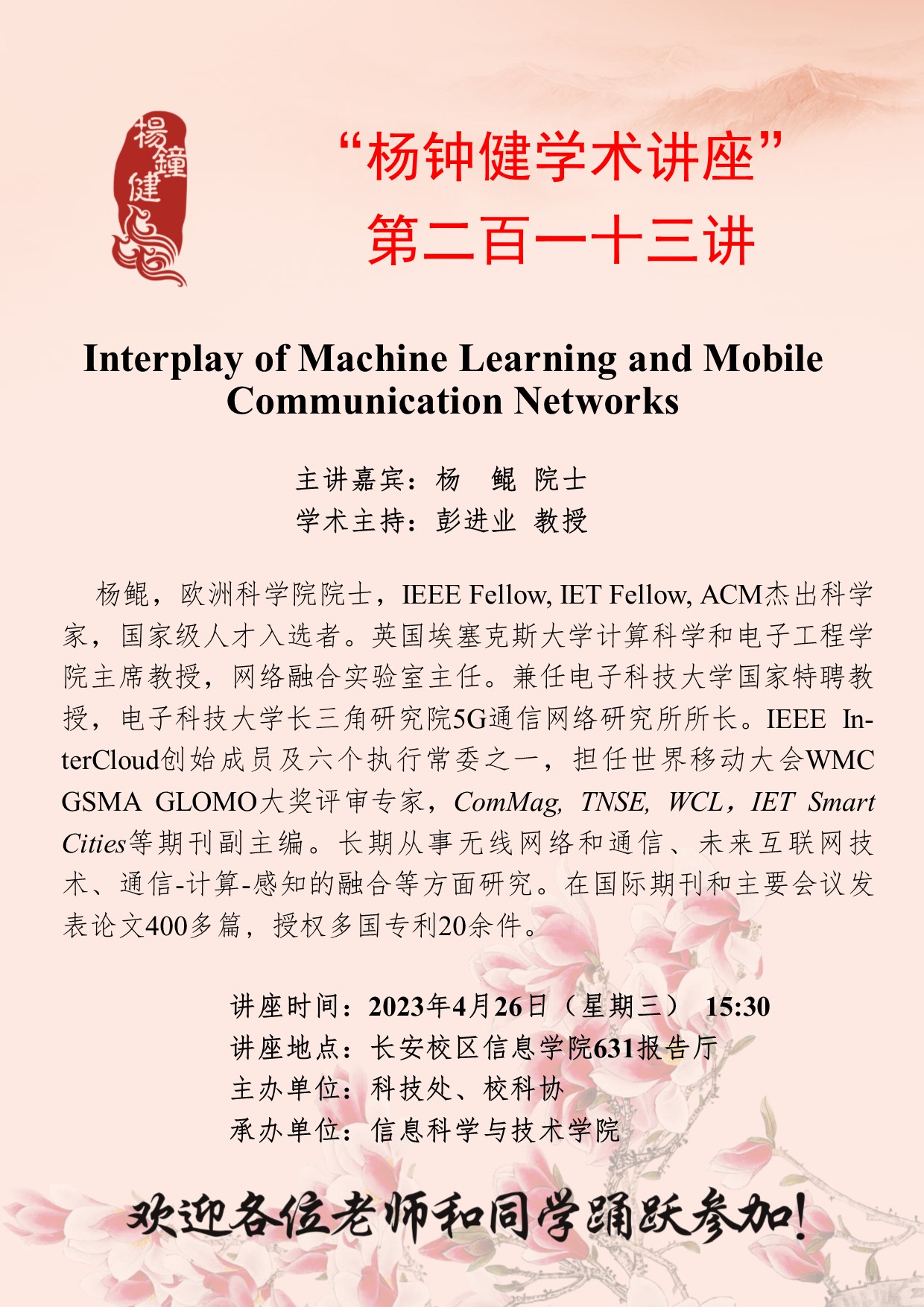 杨鲲 院士 “杨钟健学术讲座”第二百一十三讲:Interplay of Machine Learning and Mobile Communication Networks 讲座时间 2023年4月26日(星期三) 15:30 讲座地点 长安校区信息学院631报告厅 讲座人介绍 杨鲲 院士 讲座内容