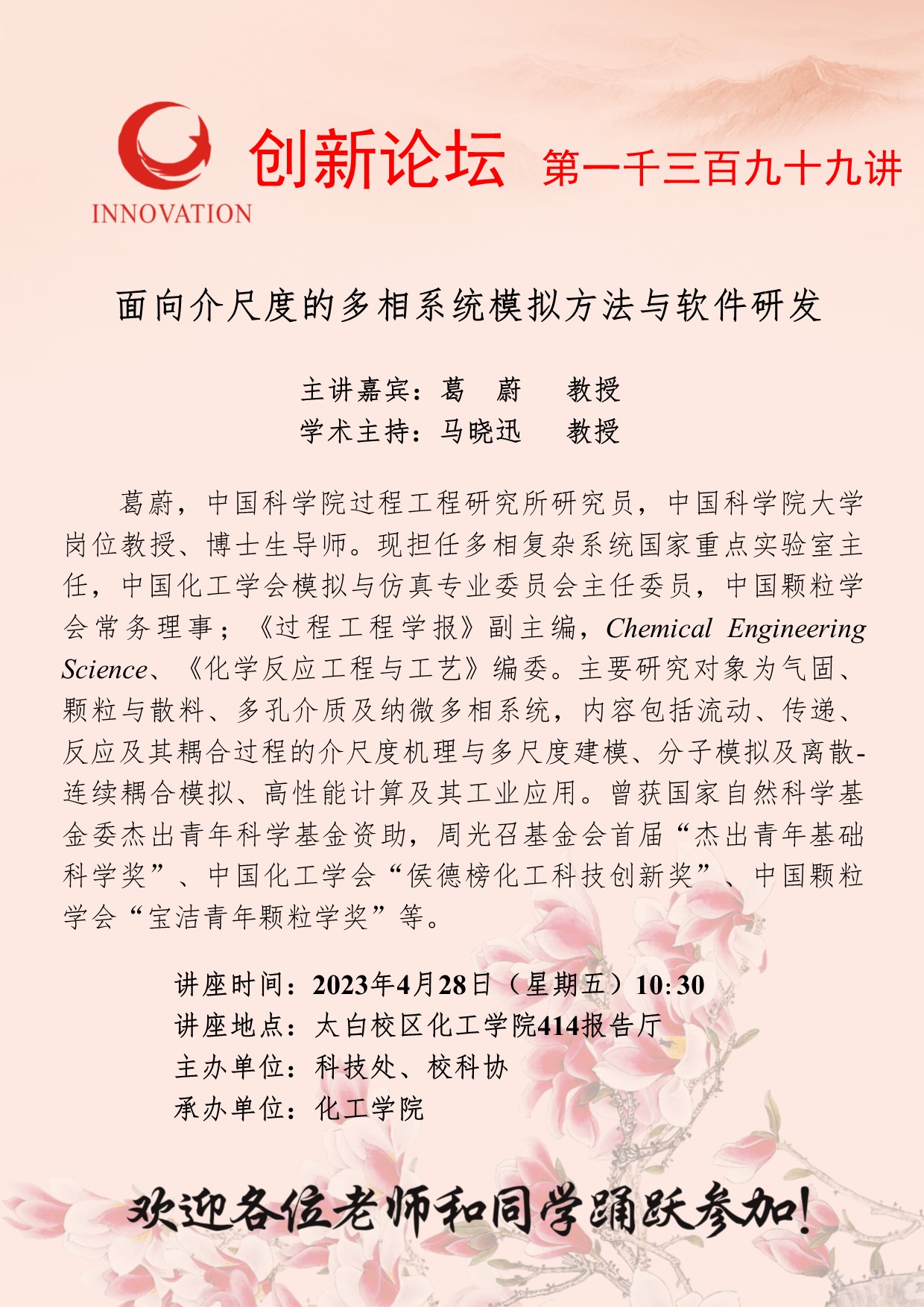 葛蔚 教授 欧冠官方网站创新论坛第一千三百九十九讲:面向介尺度的多相系统模拟方法与软件研发 讲座时间 2023年4月28日(星期五)10:30 讲座地点 太白校区化工学院414报告厅 讲座人介绍 葛蔚 教授 讲座内容