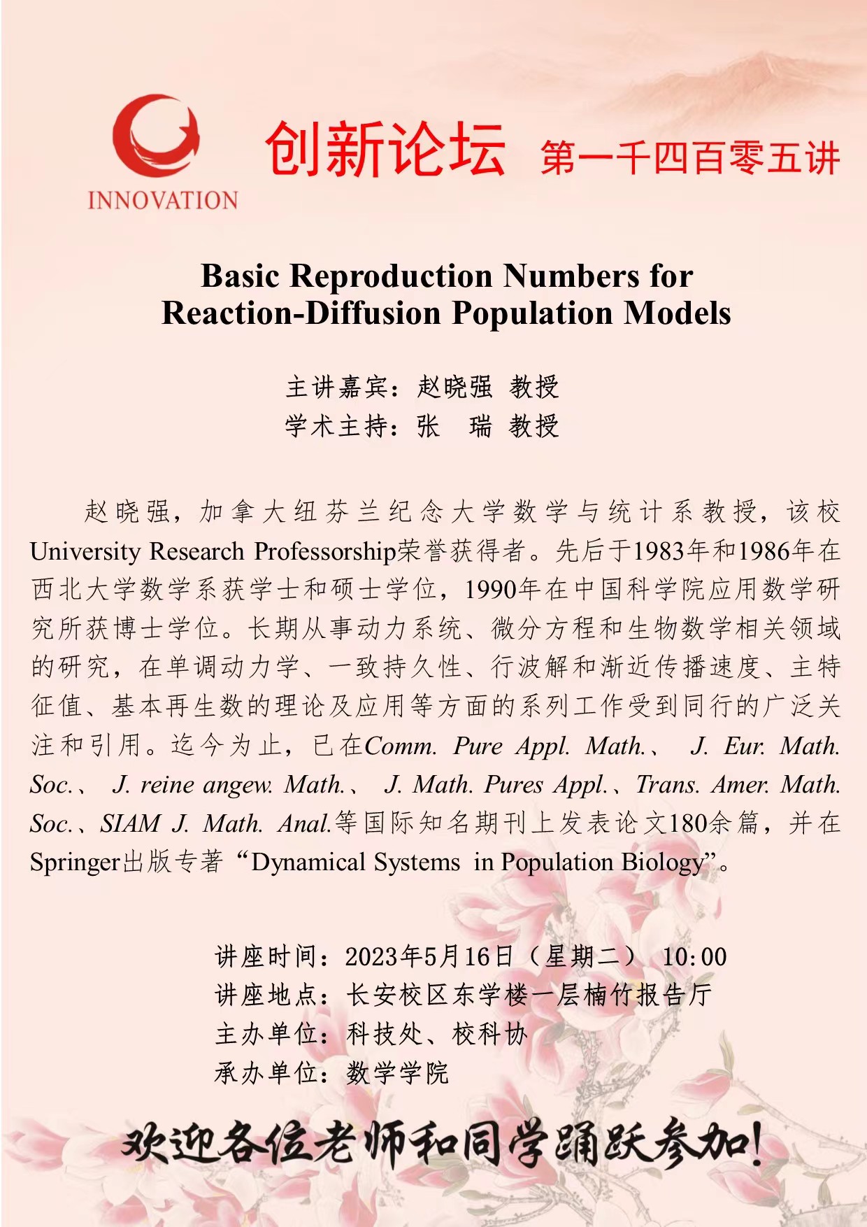 赵晓强 教授 欧冠官方网站创新论坛第一千四百零五讲:Basic Reproduction Numbers for Reaction-Diffusion Population Models 讲座时间 2023年5月16日(星期二) 10:00 讲座地点 长安校区东学楼一层楠竹报告厅 讲座人介绍 赵晓强 教授 讲座内容