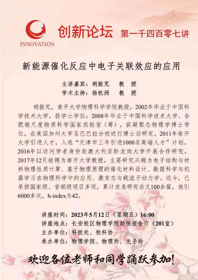 胡振芃 教 授 欧冠官方网站创新论坛第一千四百零七讲:新能源催化反应中电子关联效应的应用 讲座时间 2023年5月12日(星期五)16:00 讲座地点 长安校区物理学院劼恒报告厅(201室) 讲座人介绍 胡振芃 教 授 讲座内容