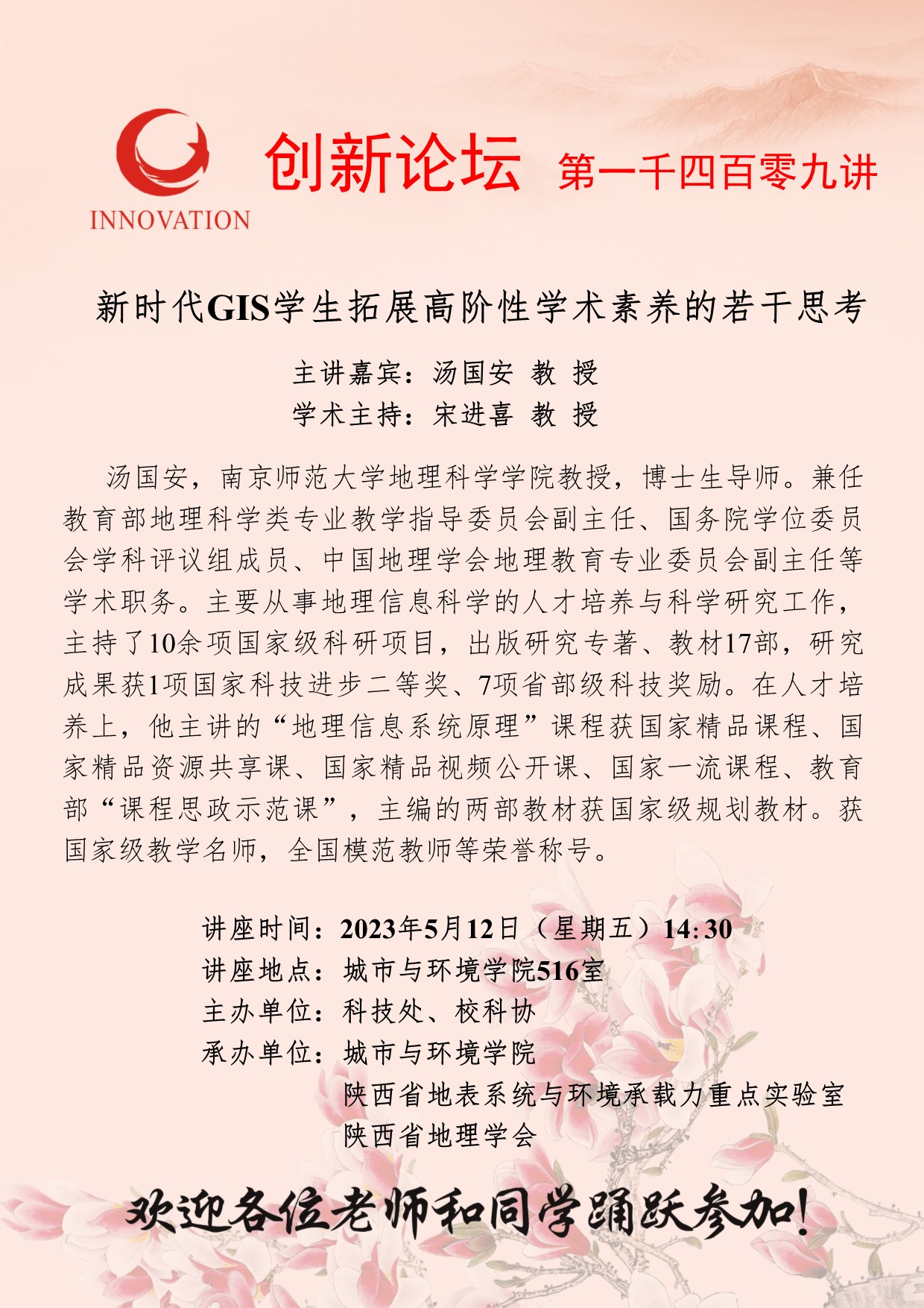 汤国安 教授 欧冠官方网站创新论坛第一千四百零九讲:新时代GIS学生拓展高阶性学术素养的若干思考 讲座时间 2023年5月12日(星期五)14:30 讲座地点 城市与环境学院516室 讲座人介绍 汤国安 教授 讲座内容