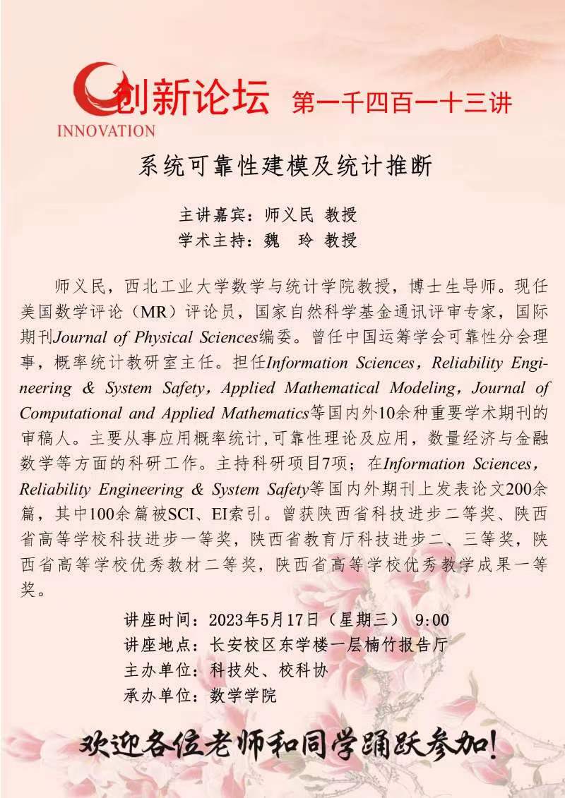 师义民 教授 欧冠官方网站创新论坛第一千四百一十三讲:系统可靠性建模及统计推断 讲座时间 2023年5月17日(星期三) 9:00 讲座地点 长安校区东学楼一层楠竹报告厅 讲座人介绍 师义民 教授 讲座内容
