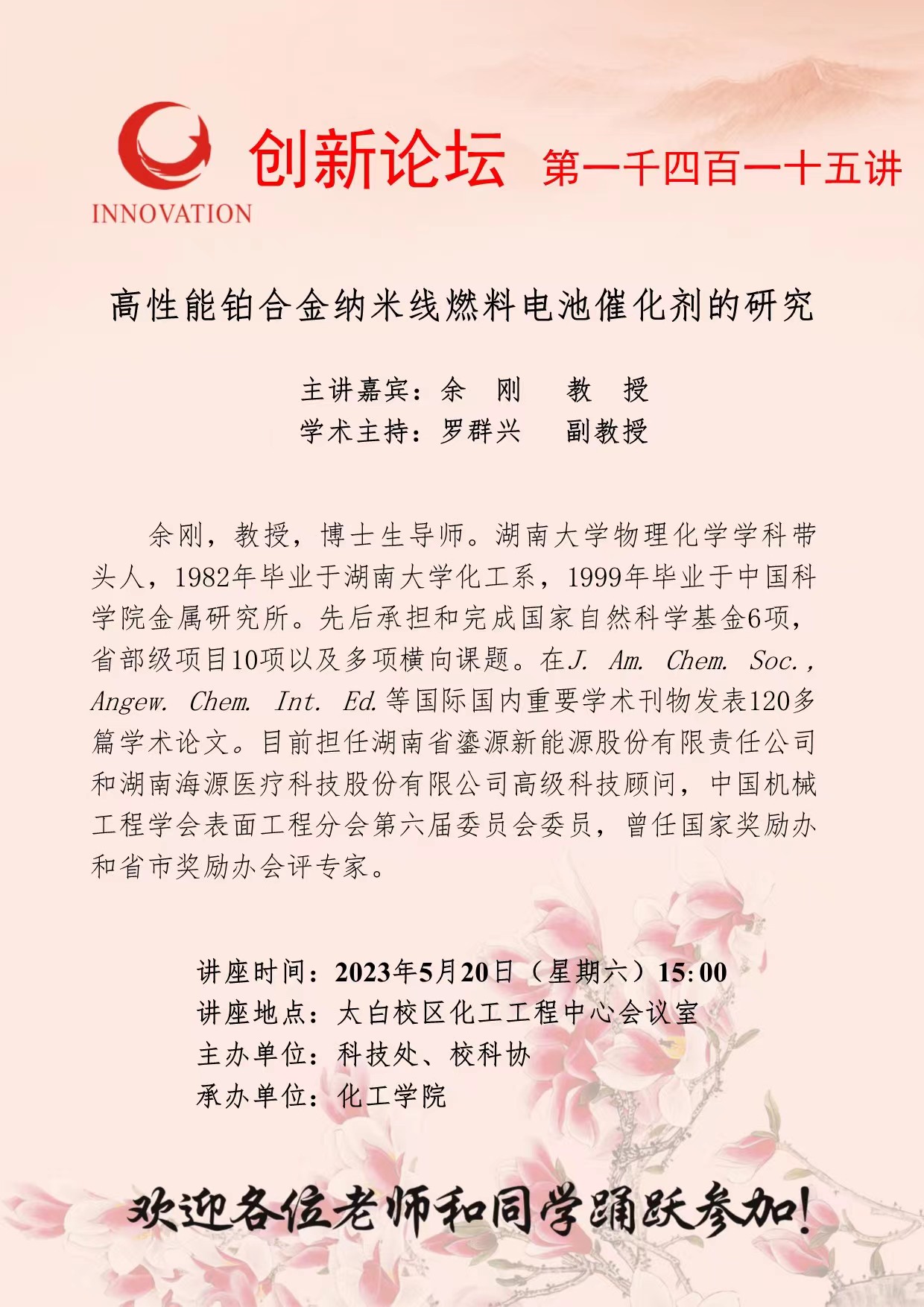 余 刚 教 授 欧冠官方网站创新论坛第一千四百一十五讲:高性能铂合金纳米线燃料电池催化剂的研究 讲座时间 2023年5月20日(星期六)15:00 讲座地点 太白校区化工工程中心会议室 讲座人介绍 余 刚 教 授 讲座内容