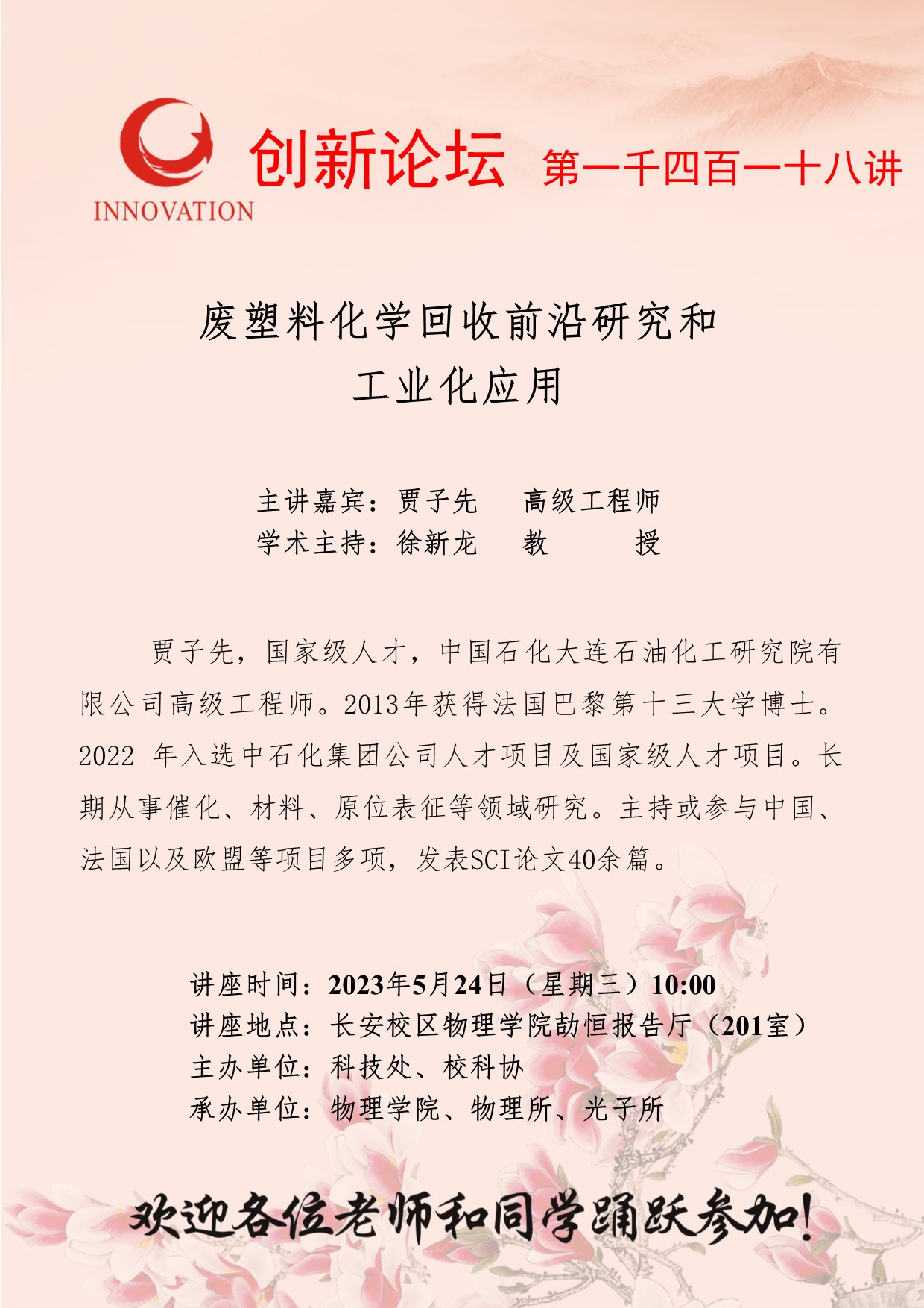 贾子先 高级工程师 欧冠官方网站创新论坛第一千四百一十八讲:废塑料化学回收前沿研究和工业化应用 讲座时间 2023年5月24日(星期三)10:00 讲座地点 长安校区物理学院劼恒报告厅(201室) 讲座人介绍 贾子先 高级工程师 讲座内容
