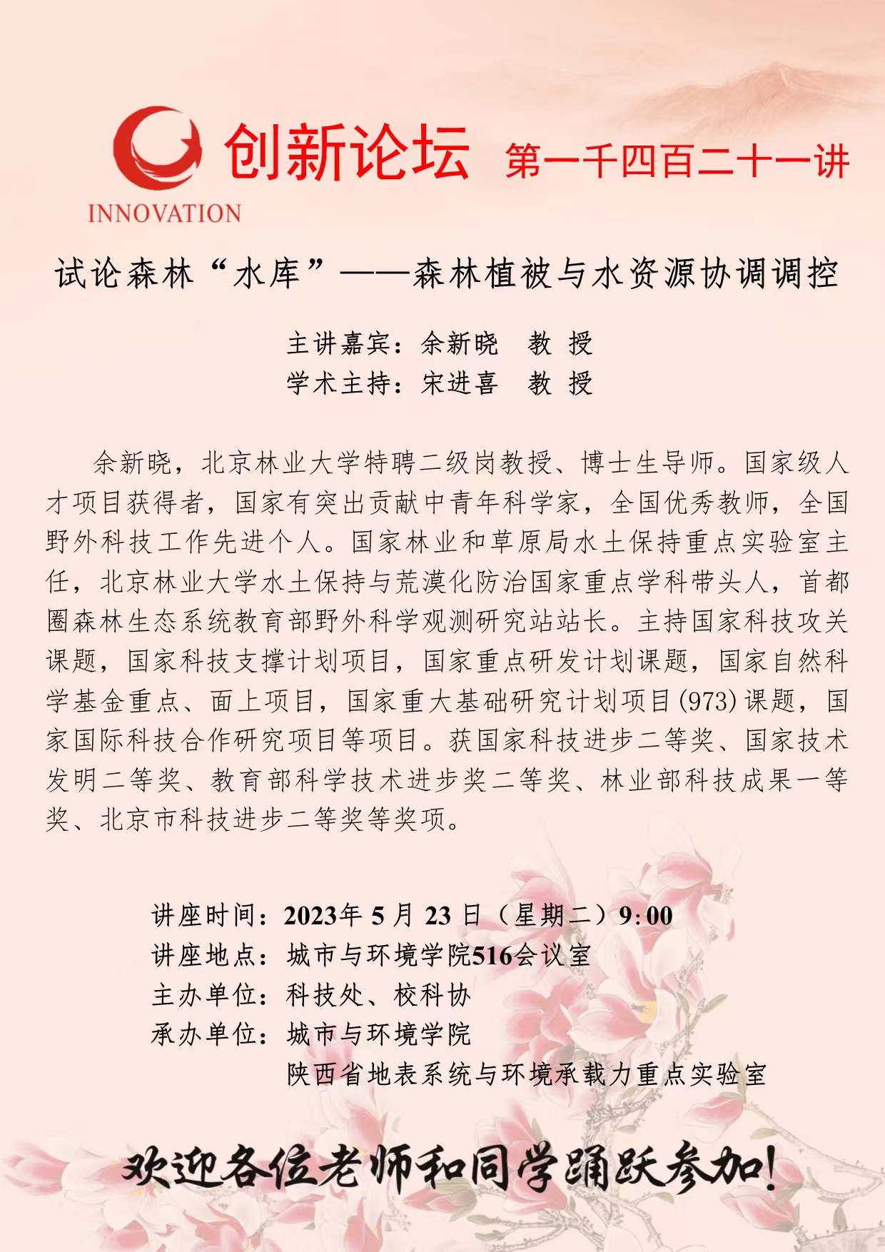 余新晓 教 授 欧冠官方网站创新论坛第一千四百二十一讲:试论森林“水库”——森林植被与水资源协调调控 讲座时间 2023年5月23日(星期二)9:00 讲座地点 城市与环境学院516会议室 讲座人介绍 余新晓 教 授 讲座内容
