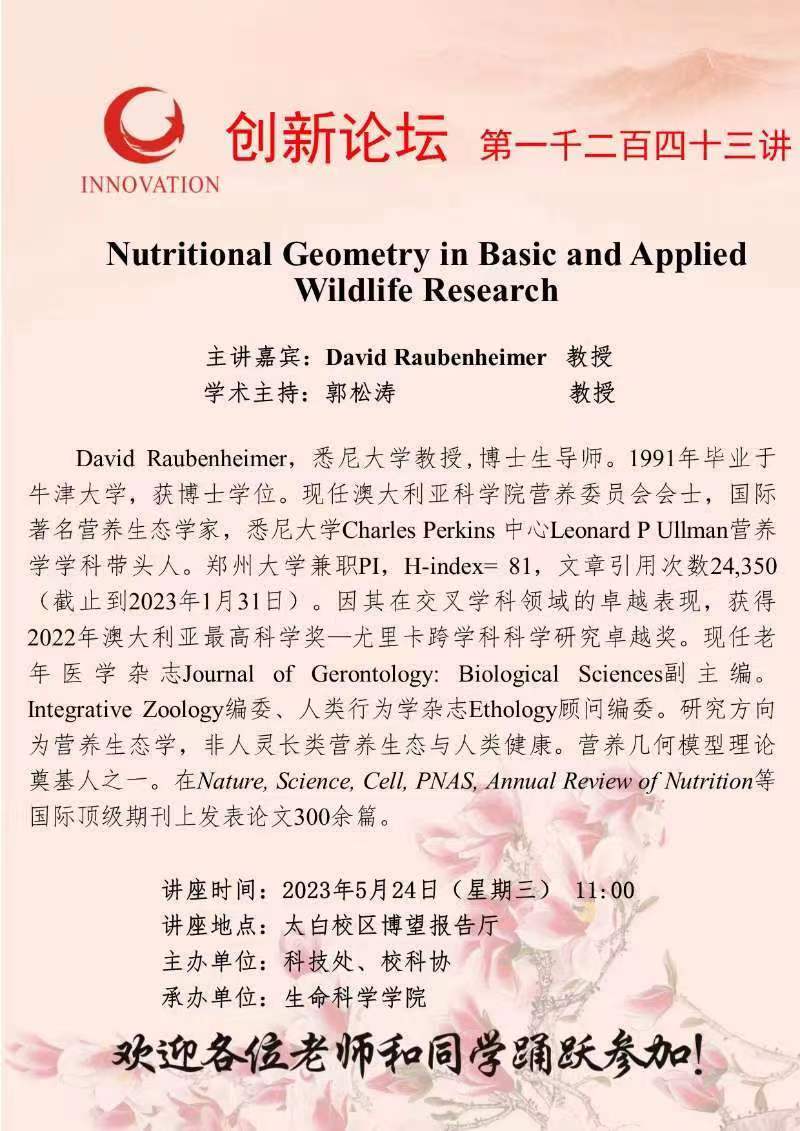 David Raubenheimer 教授 欧冠官方网站创新论坛第一千四百二十四讲:Nutritional Geometry in Basic and Applied Wildlife Research 讲座时间 2023年5月24日(星期三)11:00 讲座地点 太白校区博望报告厅 讲座人介绍 David Raubenheimer 教授 讲座内容